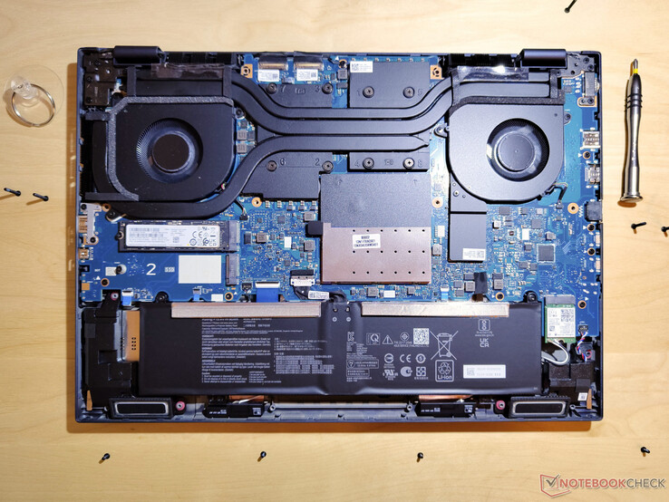 然而,这台拥有16英寸屏幕和宽大显示边缘的二合一笔记本电脑,作为一台工作站,其体积异常庞大,也相当沉重。 华硕将一个非常强大的冷却系统放置在这个有点笨重的箱子里,使其几乎能承受任何挑战。大型风扇和散热片确保内部组件保持冷却。