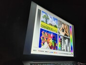 承诺的 400 cd/m² 的亮度绰绰有余,平均测量亮度为 457 cd/m²。在参与对比的商务笔记本电脑中,这是亮度第二高的屏幕,仅次于 ThinkPad T14s 6 代亮度更高,但分辨率却远低于 WUXGA(1,920 x 1,200)。特别是与 惠普 EliteBook Ultra G1q勉强超过 300 cd/m² 大关。