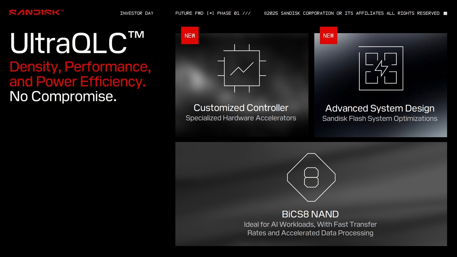 UltraQLC 是根据我们数十年的经验和当前的学习成果定制的,可真正部署在现代数据基础设施中,同时不影响密度、性能和能效。它就是围绕这三点打造的:[...]BICS 8 NAND 技术[以及未来的 NAND]、定制的控制器和先进的系统设计--Khurram Ismail,即将上任的闪迪工程与产品管理总监