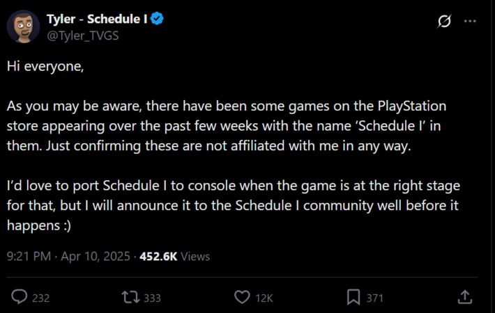 当一款 PC 游戏获得成功时,主机玩家往往会羡慕不已。附表 1》在 Steam 上引起了轰动,这款异想天开的毒品交易游戏赢得了 大量玩家.为了利用它的人气,PlayStation 商店出现了几款山寨游戏。作为回应,《Schedule 1》游戏开发商将 TVGS 与这些模仿者撇清了关系。泰勒还在社交媒体上暗示,官方游戏机移植版是可能的.