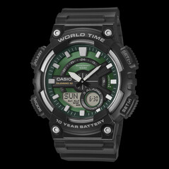 对于需要从手表中获得更多数据的用户,AEQ-110W-3A2V配备了模拟数字混合显示屏。其主要技术指标是由 CR2025 电池供电的 10 年电池周期。该模块包括 30 条 Telememo 数据库和支持 30 个城市的世界时间等传统功能。它的厚度为 16.7 毫米,是该系列中最厚的表款,这也是液晶显示屏和机械指针内部堆叠所必需的。尽管如此,该表款仍具备纯指针式表款的 100 米防水性能。