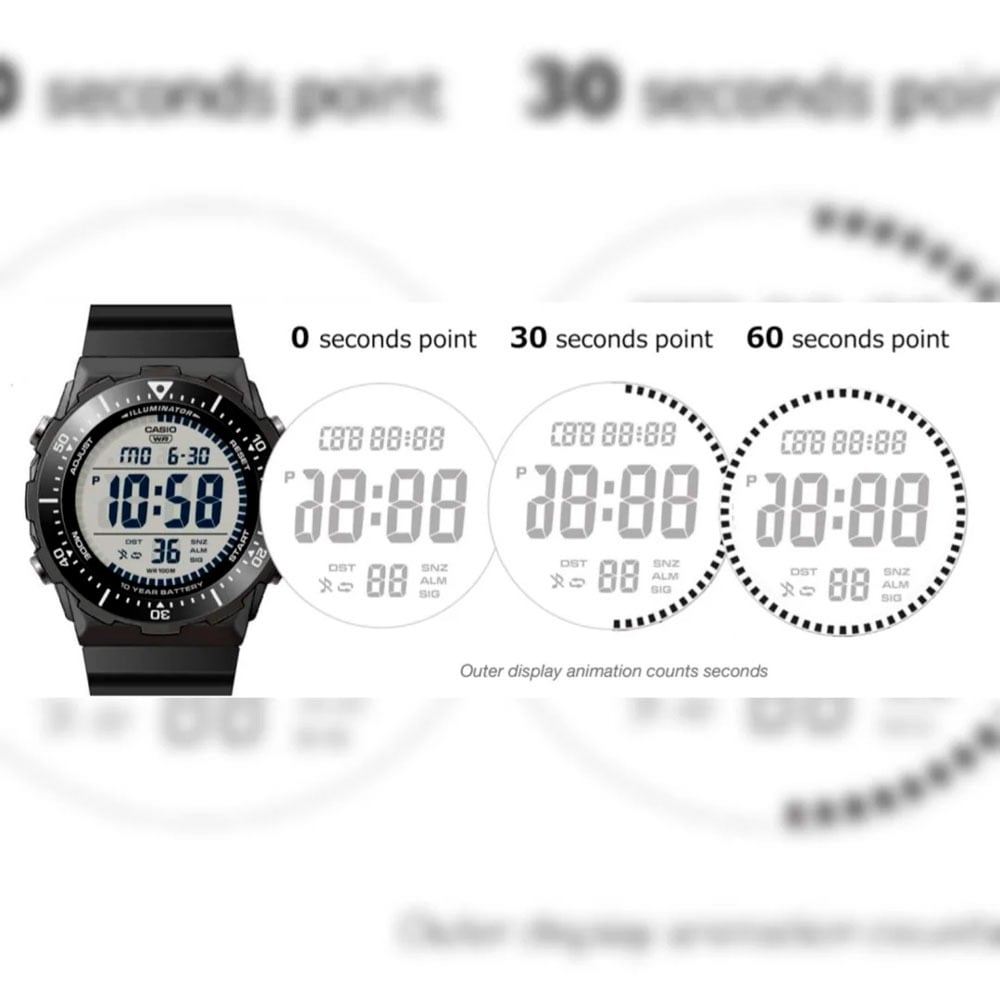 其核心功能包括双时区显示、24 小时计时、带自动重复功能的倒计时器、闹钟、小时报时、全自动日历、琥珀色 LED 背光和 100 米防水。数字显示屏的外圈还有一个漂亮的动画秒针计数器。表镜为塑料材质,表带和表壳则由树脂制成,经久耐用。