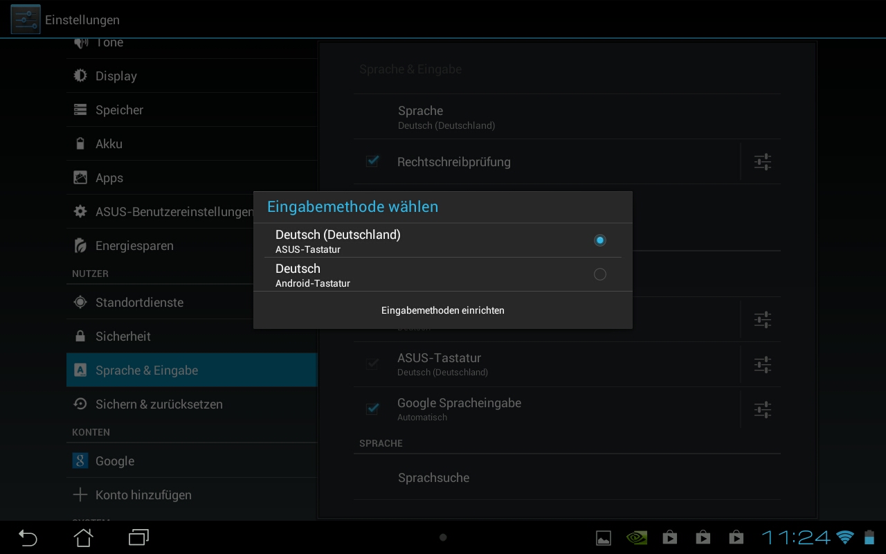 华硕预安装的Android4.1.1果冻豆,而不是谷歌的Android4.2操作系统,最新版本的。台湾制造商修改和调整软件在不少领域。系统设置让通常不可见的调整:例如,在这里可以配置连接的鼠标按钮。攻丝系统时钟,打开一个菜单,还设有额外的项目 - 如电源设置,例如。华硕还修改了虚拟键盘 - 如何成功修改,我们将在以后讨论。