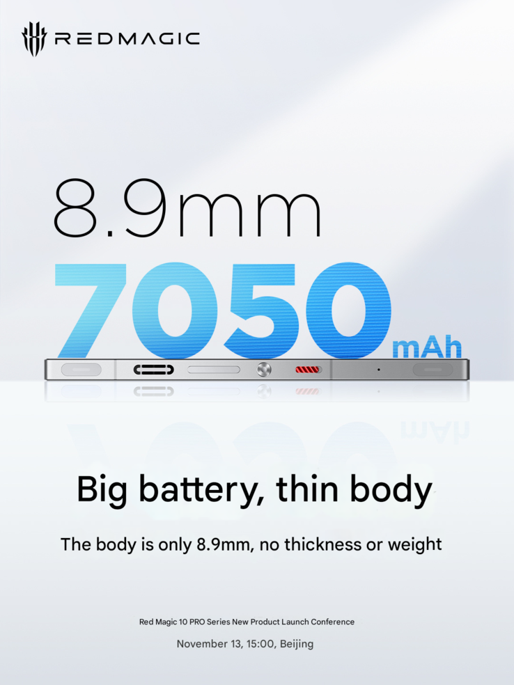红魔将于 11 月 13 日全面发布下一代旗舰手机 将于 11 月 13 日正式发布。到目前为止,该品牌已经确认了 RedMagic 10 Pro 的许多功能。最新的预告证实,这款新的骁龙 8 精英游戏手机将配备 7050 毫安时电池,而过去的报道也曾暗示过这一点。