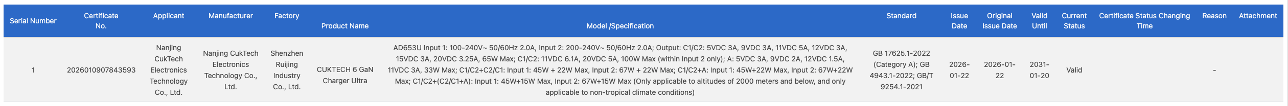 现在,Cuktech 6 GaN Charger Ultra 已出现在中国质量认证中心 (CQC) 的数据库中。.该条目表明,这款尚未发布的配件已获得 CCC(中国强制性产品认证)或 3C 认证。该页面还显示了该产品的部分功能。