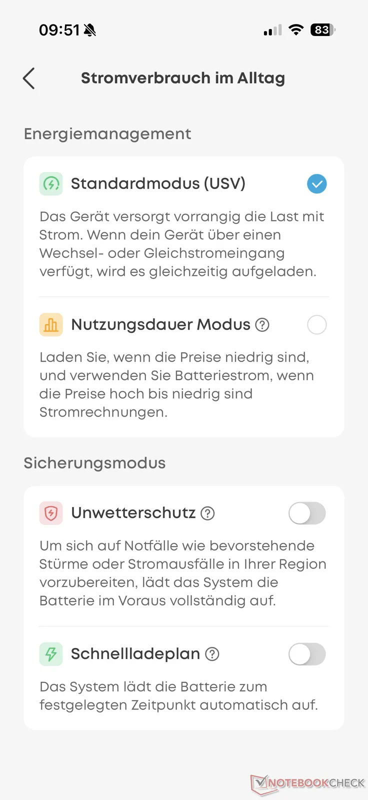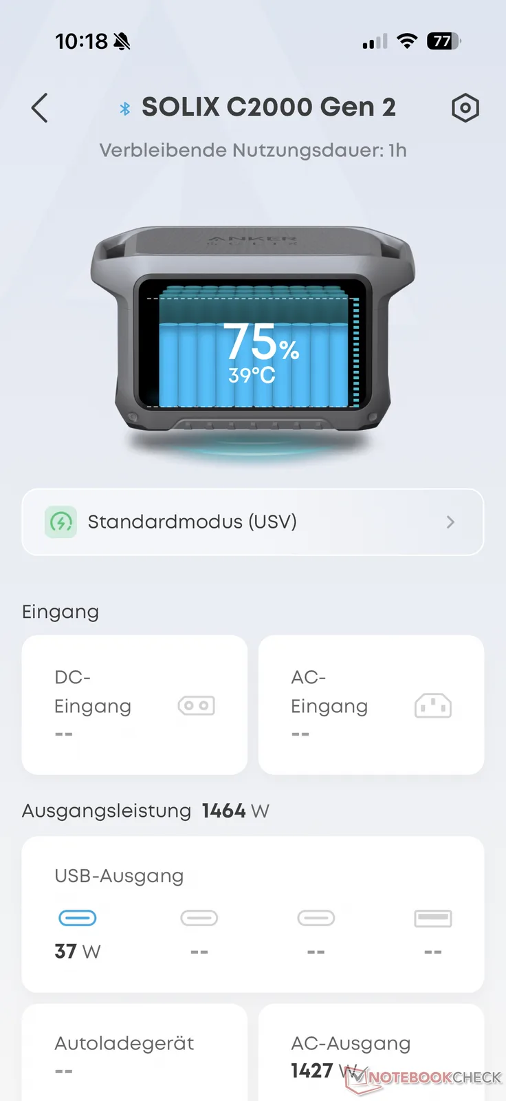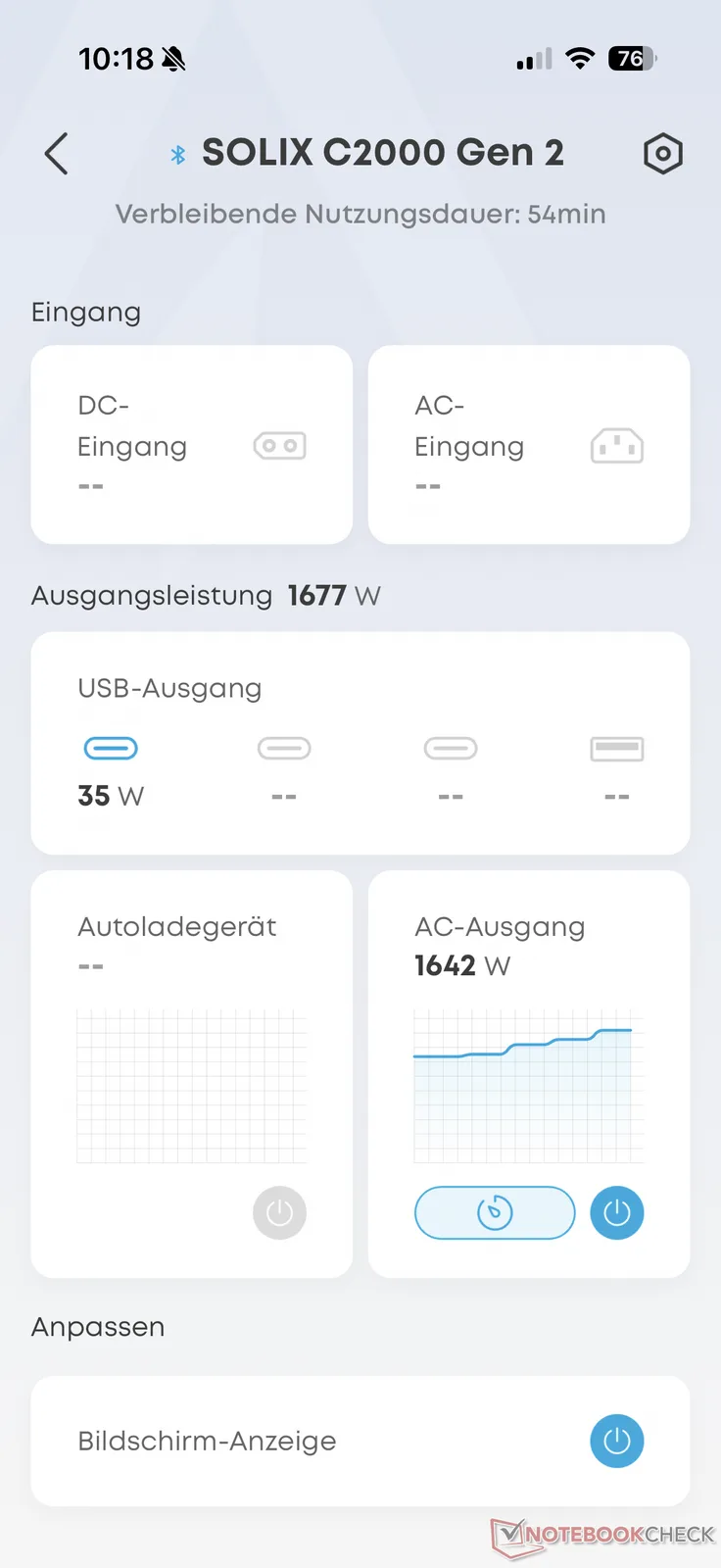 不过,在测试中,我们对交流电源的运行效率并不完全信服。像往常一样,我们在测试中为 Anker Solix C2000 Gen 2 连续耗电 200 W。在 2048 瓦的容量中,我们消耗了 1600 瓦。这导致可用能量略低于 79%,并不划算。例如 Aferiy P280在测试中被证明更高效。