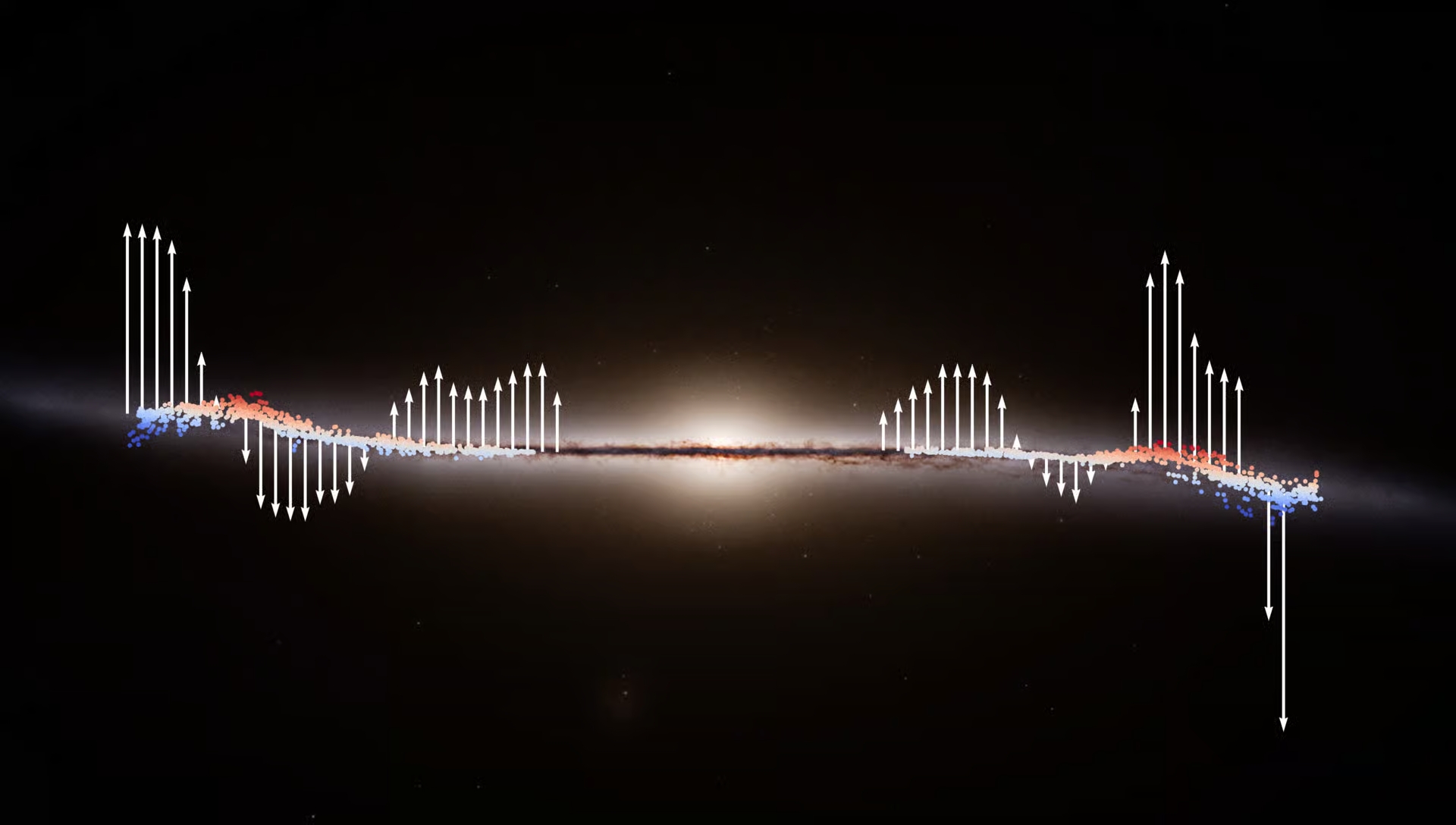 为了更好地理解这一现象,我们可以参考几张图片。左边的图片是从上方看银河系,右边的图片则是侧面图。请注意,波的颜色是红色和蓝色,在红色区域,恒星位于星系盘的上方,而在蓝色区域,恒星位于星系盘的下方。