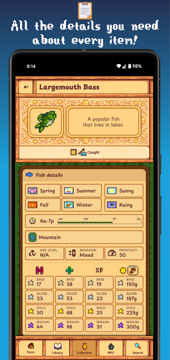 BlueCaret 的《星露谷》应用程序可让玩家通过智能手机轻松跟踪游戏进度。它拥有完整的物品数据库、社区中心和乔贾路线指南、所有村民的详细礼物偏好以及整齐划一的收集清单。一次性付费 5.99 美元的高级升级版还提供其他工具。这些工具包括完美度追踪器、备注、日历、待办事项列表以及对管理多个农场的支持。
