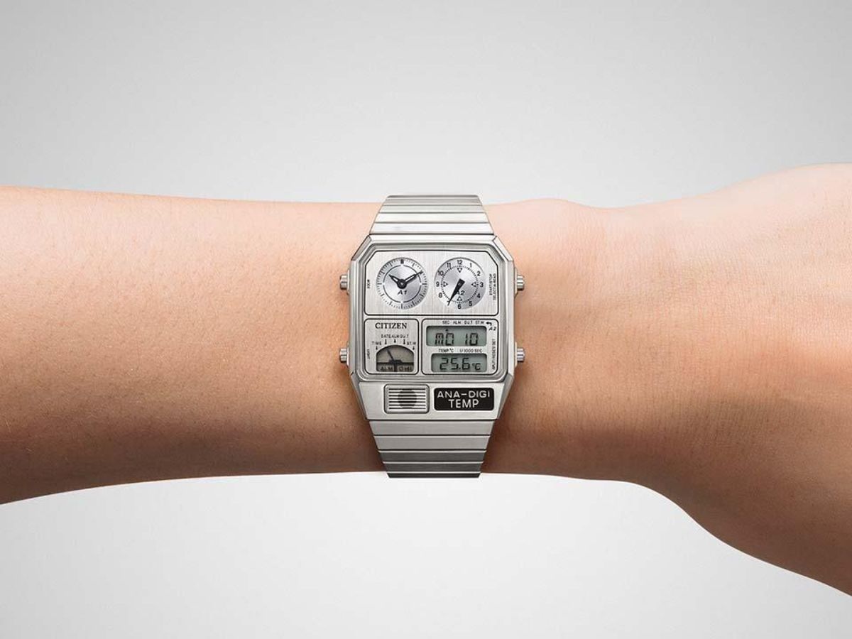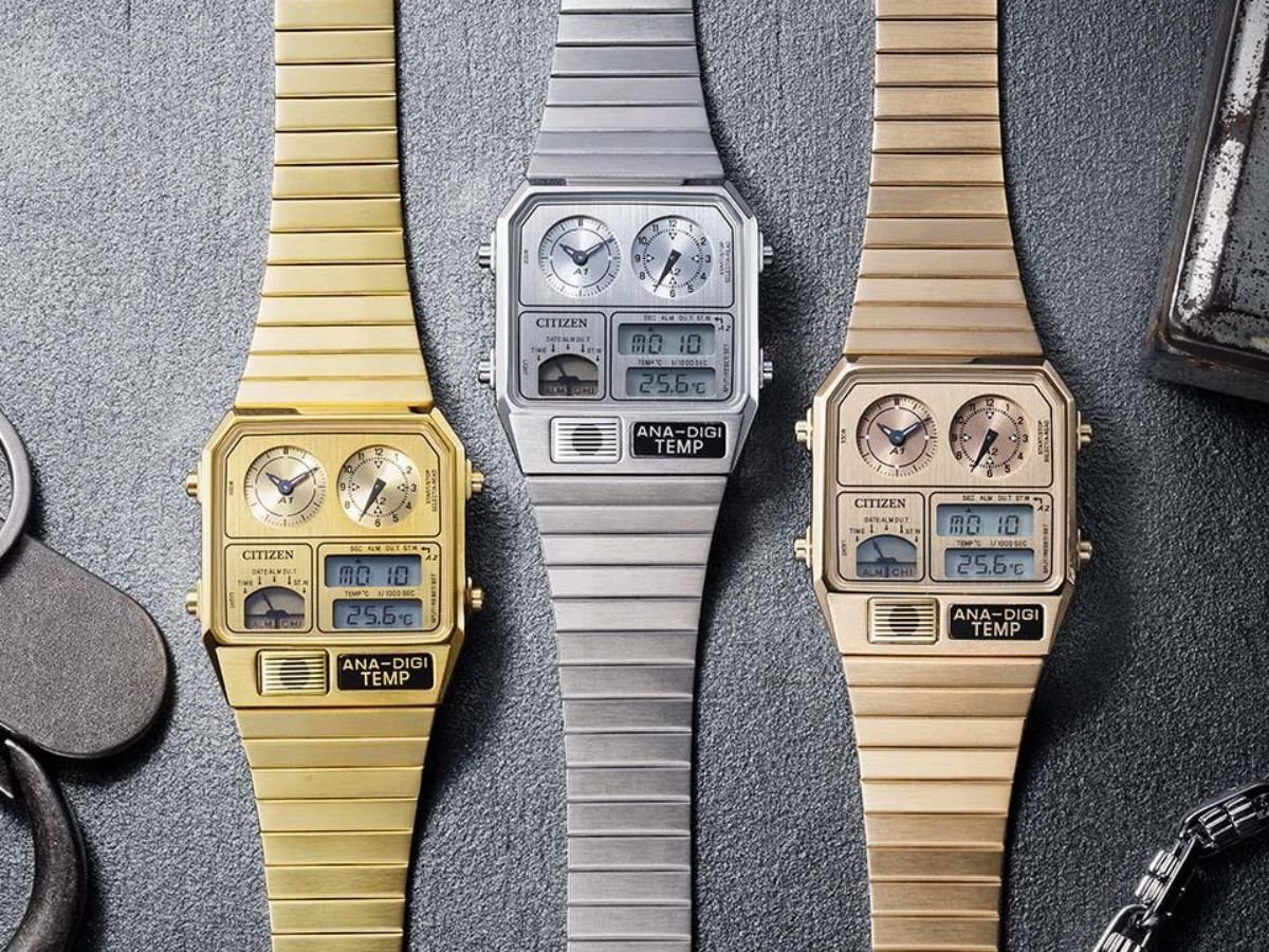 Citizen Ana-Digi Temp 手表于 20 世纪 80 年代推出,公司称其采用了 "复古未来主义设计"。表壳、表盘和表带均由同色不锈钢制成,在不同部件上以不同方向进行发丝处理,为设计带来质感。每个款式都有一个方形表盘,表盘最下方有 Ana-Digi Temp 字样。