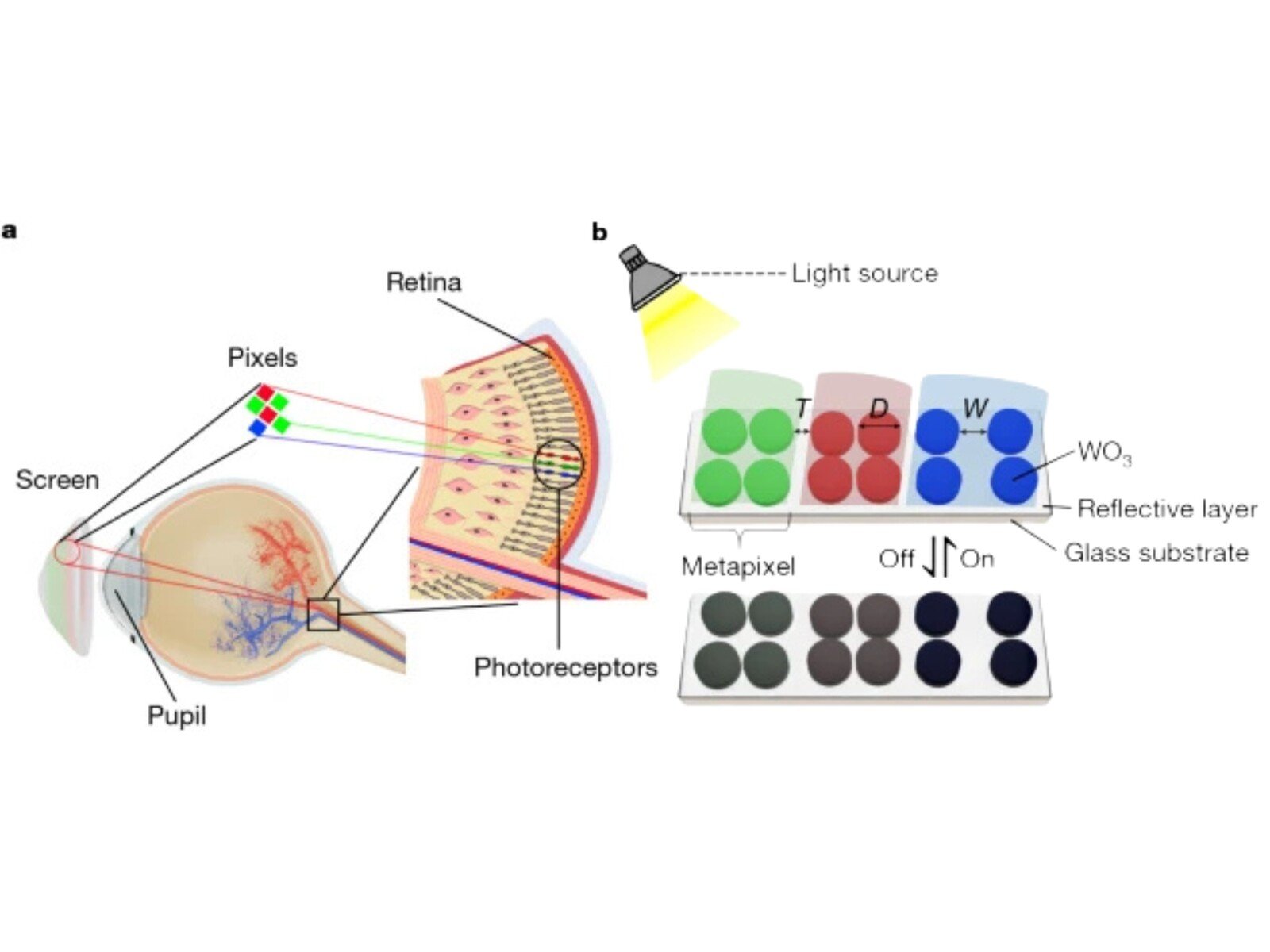 OLED 和微型 LED 显示器在极度微型化的过程中面临着物理限制,包括亮度降低、色彩不稳定和能耗增加,而 Retina E-Paper 则采用了不同的方法。它不发射光,而是利用环境光照。它的电致变色纳米像素由层叠在铂铝基底上的三氧化钨(WO₃)制成,可以反射进入的光线。通过选择性地插入离子,这种材料可以在绝缘态和金属态之间切换,从而实现对颜色的精确电控制。