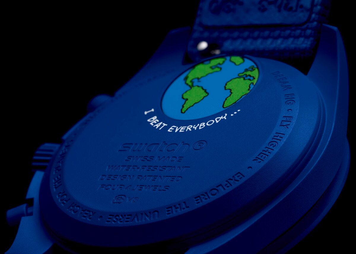 这款 "海狸月 "版腕表为月盘设计了俏皮的 "咬合 "图案,并在满月刻度上使用了欧米茄月光金(Moonshine Gold)。表壳为海军蓝Bioceramic(一种陶瓷+生物材料的混合物),搭配海军蓝魔术贴橡胶表带、Super-LumiNova时标、盒形生物材料玻璃和表盘上的UV墨水秘密细节。该表款依然沿用了超霸系列的设计元素--不对称表壳和90点以上的测速计,同时增加了史努比主题艺术品和以地球为灵感的电池盖。