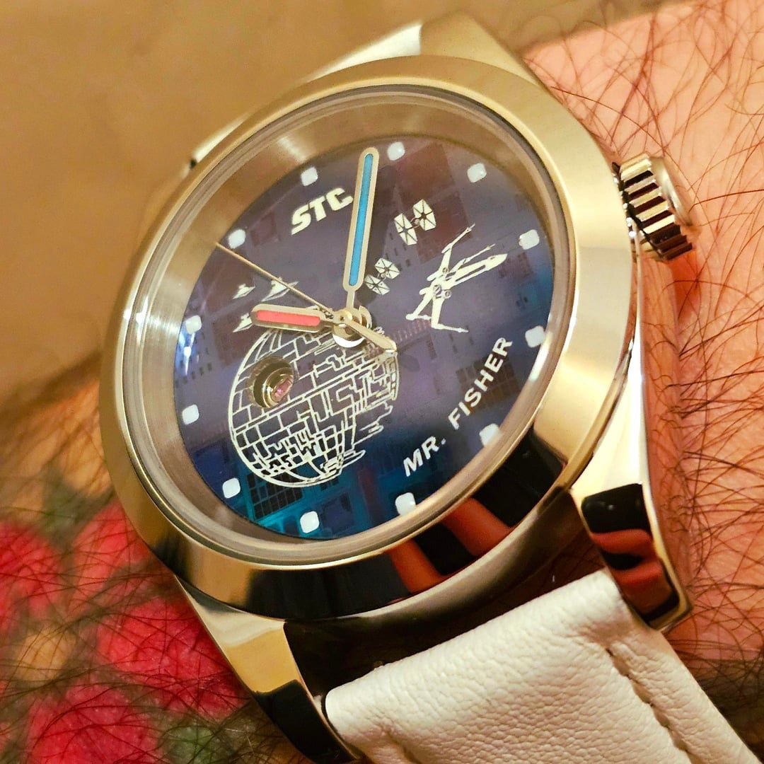 该表搭载NH38 装饰机芯。表壳直径 40 毫米,顶部为蓝宝石水晶玻璃,表盘则是最引人注目的地方。表盘采用威化片式设计,层层叠加《星球大战》的图案--死星、一对正在追逐的战舰,以及写有 "费舍尔先生 "的小字,巧妙地引用了卡莉-费舍尔(Carrie Fisher)的名字。在《星球大战》原版电影中扮演莱娅公主的凯莉-费舍尔。网格状的背景和微微反光的表面表明,制作者使用了一块真正的硅晶片作为底座,不过他们后来澄清说,只有表盘部分是手工制作的。他们没有使用真正的光刻芯片,因为制作光刻芯片需要工业工具,成本远远超出业余爱好者的承受能力。