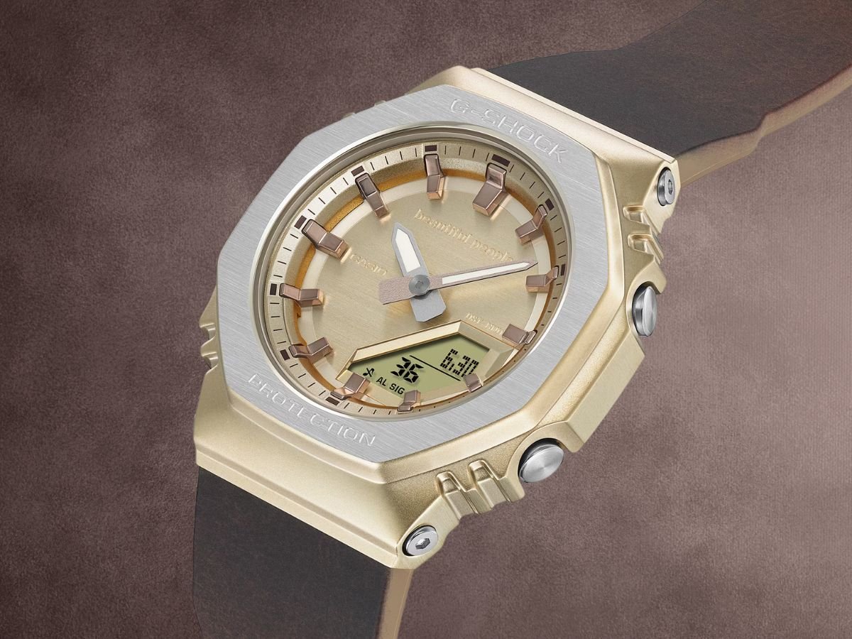 G-Shock GM-S2110BP-5A 是银色、金色和棕色元素的 "碰撞"。它拥有金色的外壳和表盘,以及银色的不锈钢表圈;表盘和表圈都经过发丝处理。与之搭配的是一条与众不同的皮革外观棕色树脂表带。表盘、表带环和表壳背面均巧妙地镌刻有 Beautiful People 标志。