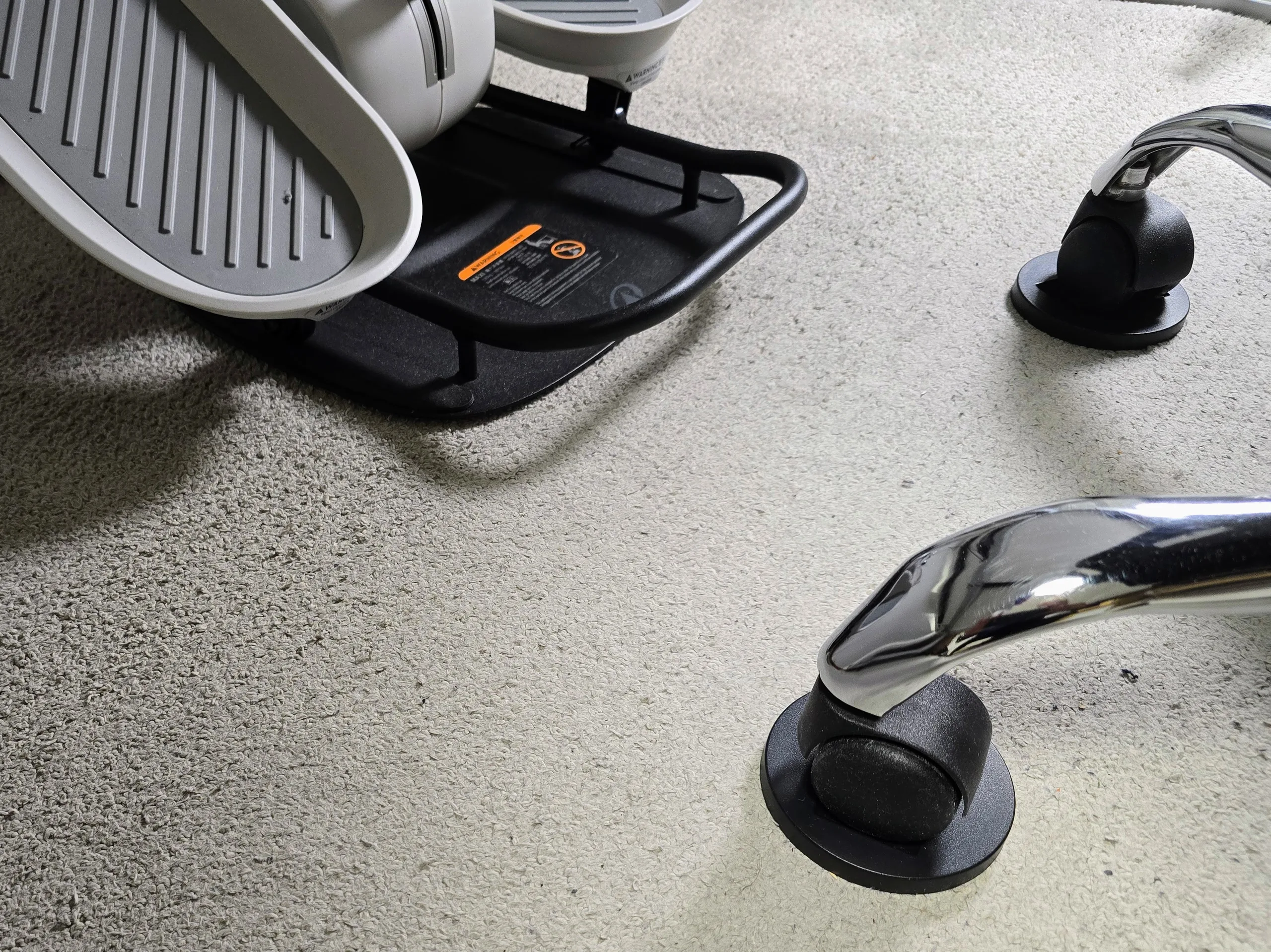 迪卡侬活动办公桌最大的挑战不是组装或操作,而是如何将它正确地放置在办公桌下。得益于它的大把手和内置脚轮,这款迷你交叉训练器很容易移动。真正的问题在于办公椅:有脚轮的办公椅往往会在您开始踩踏时滚开。