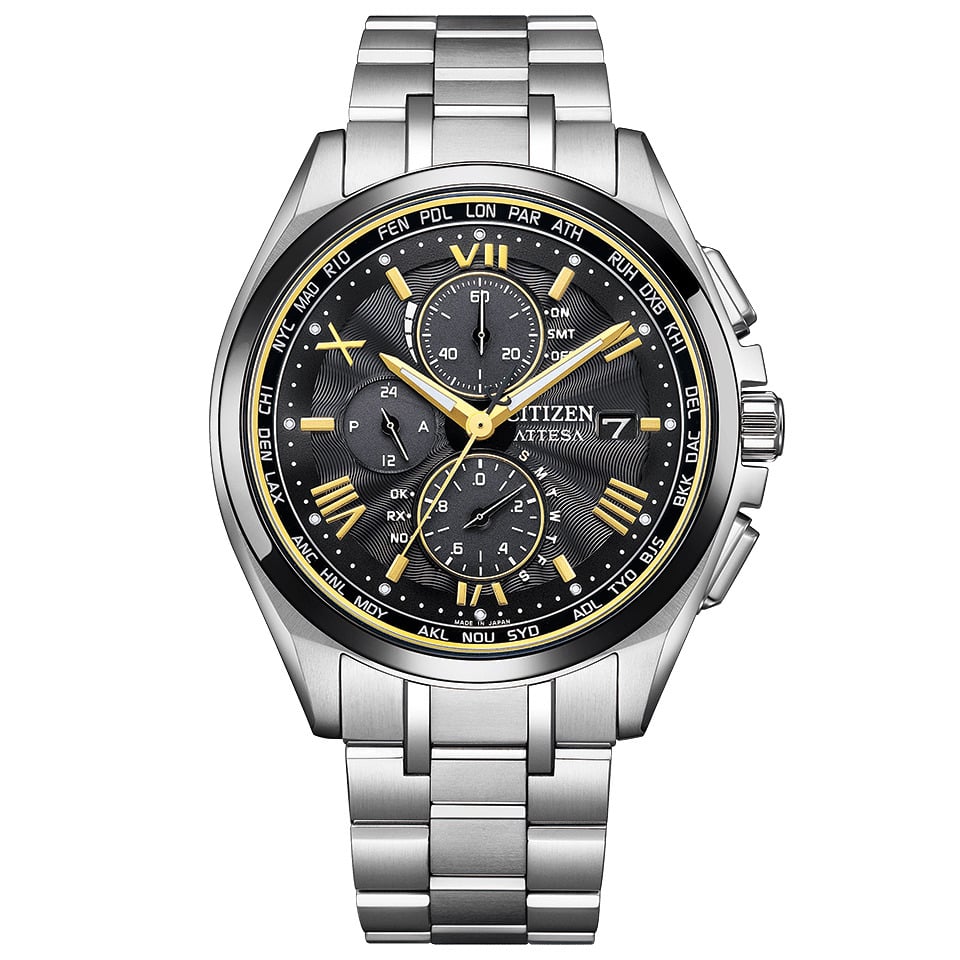 AT8244-57E Attesa 无疑是该系列中的佼佼者,其黑色扇贝纹表盘搭配金色指针和刻度。它采用 41.5 毫米厚 9.7 毫米的超级钛金属表壳,搭载 H800 无线电同步环保驱动机芯。产量上限为 1,000 只。