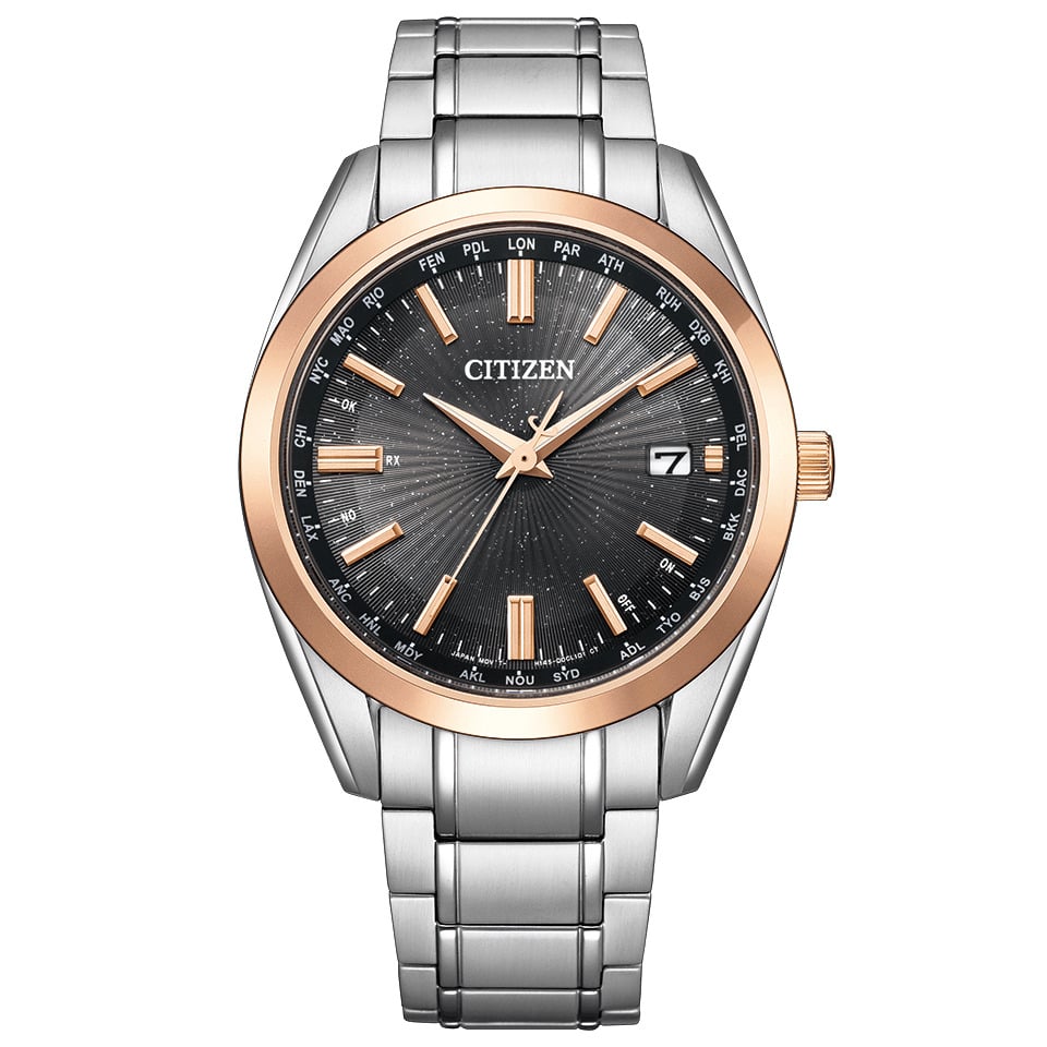 下一款是 CB0264-55E,灰色太阳纹表盘,指针、刻度和表圈均采用玫瑰金装饰。其 40 毫米超级钛金属表壳厚 10 毫米,搭载 H145 无线电同步 Eco-Drive 机芯。该表款限量发行 1200 只。
