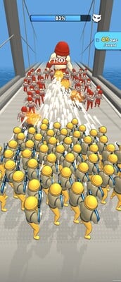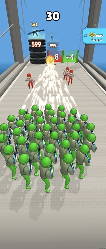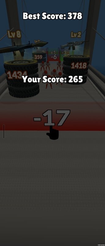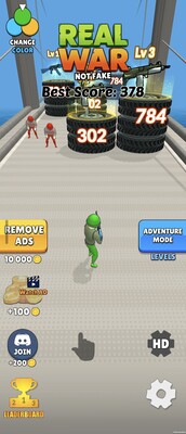 真实战争》 有两种游戏模式,一种是追踪你的最高分(我的最高分是 378 分)的无尽模式,另一种是完成关卡并赚取金币的冒险模式。金币可以用来清除广告--完成这项壮举可能需要一些时间,因为打通一个关卡可以获得 10 个金币,而清除广告则需要 10,000 个金币。还有其他赚取金币的方法,比如通过游戏菜单界面的一个选项加入开发商的 Discord,可以获得 200 个金币,或者观看广告获得 100 个金币。