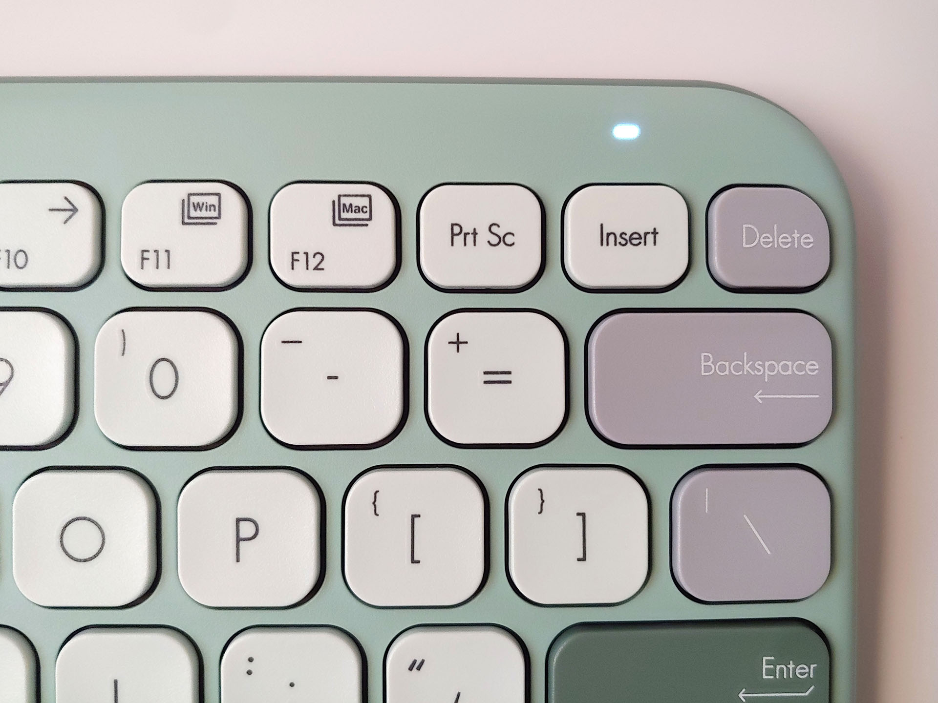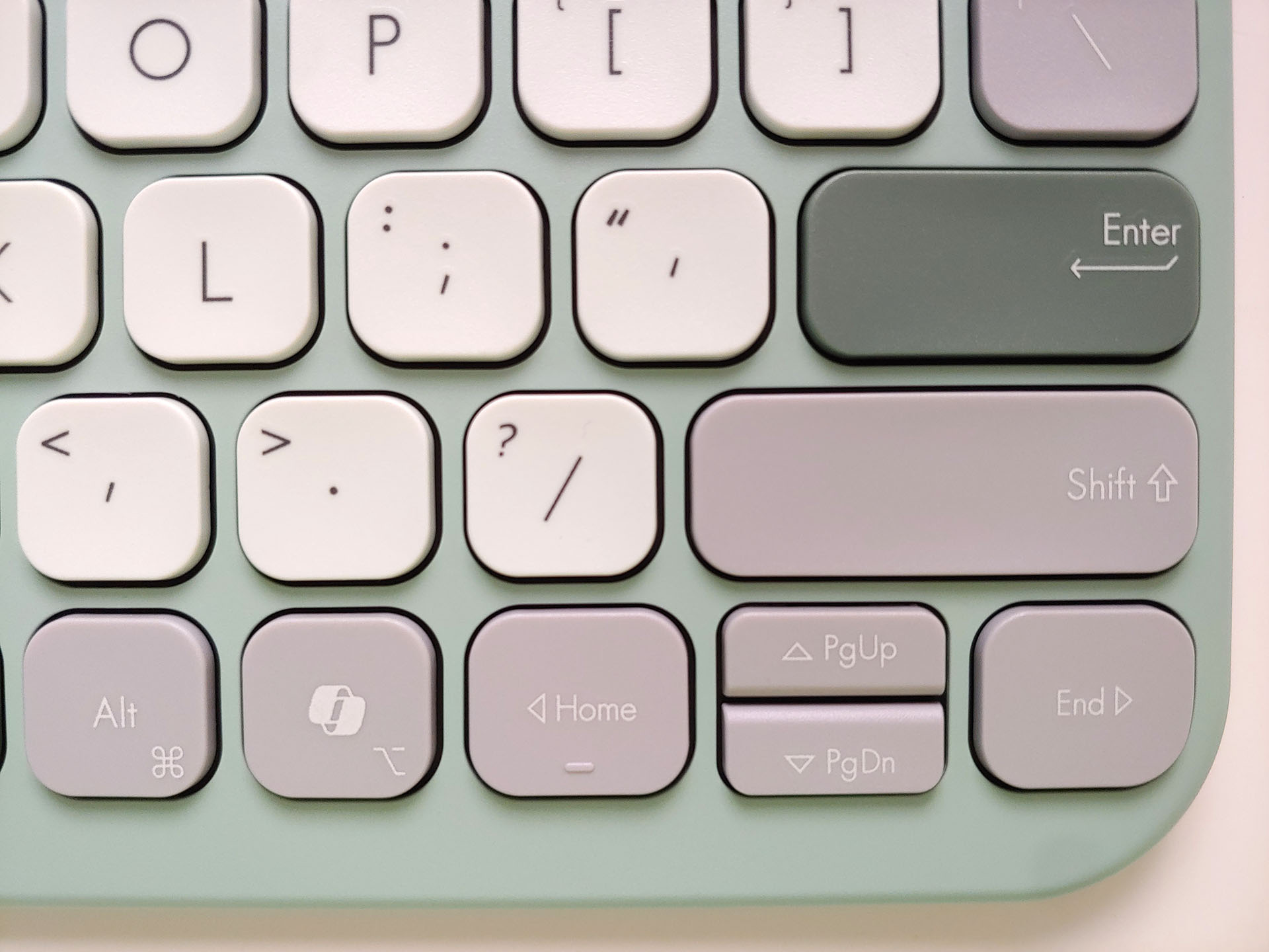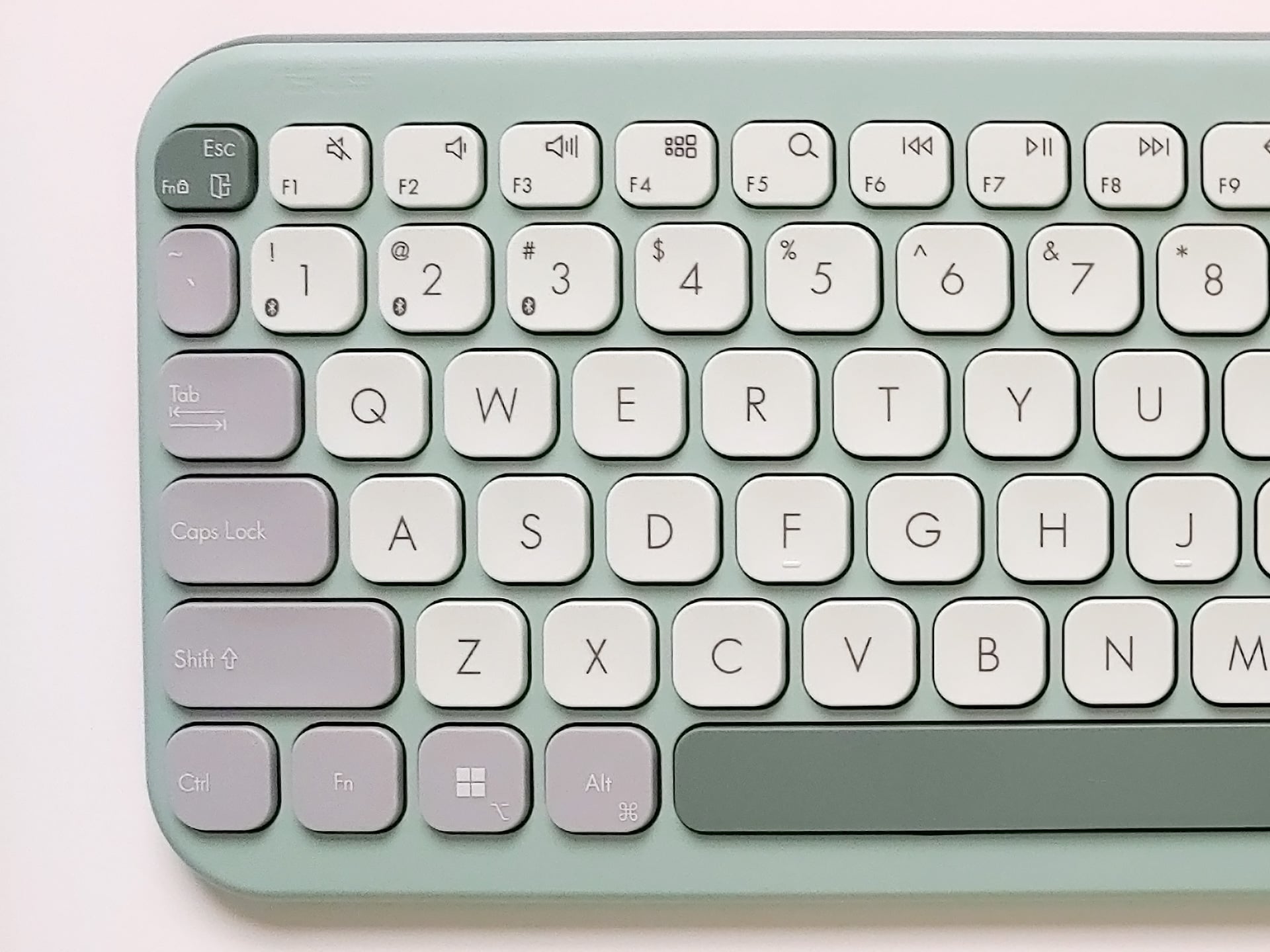 绿茶 "版本使用白底黑字键帽,具有较高的可读性,F 键和 J 键有凹陷,便于定位。最左侧和最右侧的键帽,如 Tab、Shift、Fn、Alt、Ctrl、Delete 和 Backspace,由于在浅灰色或深灰色上使用了薄而柔和的白色字样,可读性较低。