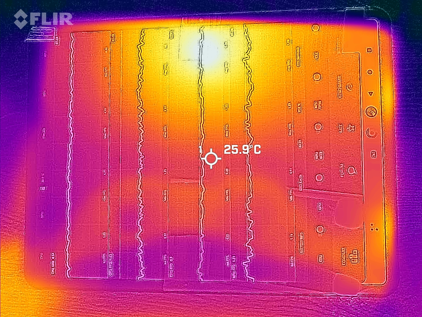 (+) In idle usage, the average temperature for the upper side is 21.5 °C / 71 F, compared to the device average of 30 °C / 86 F.