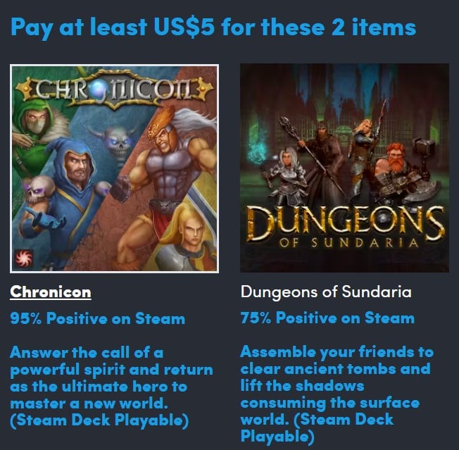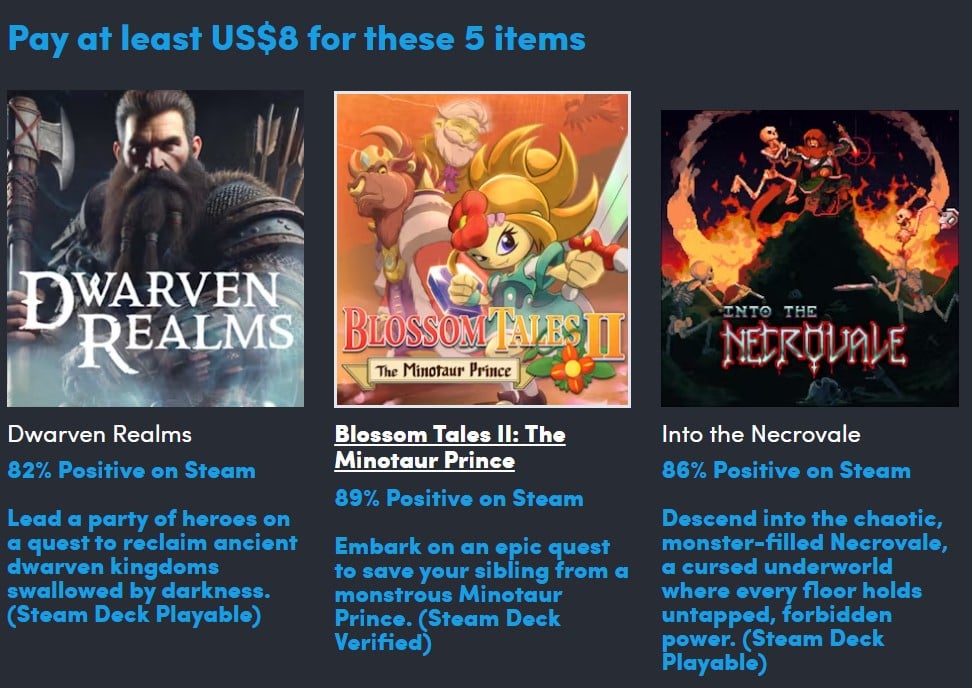 该捆绑包有三个等级可供选择:第一级以 5 美元的价格提供 2 款游戏,第二级以 8 美元的价格提供 5 款游戏,第三级以 12 美元的价格提供全部 8 款游戏。