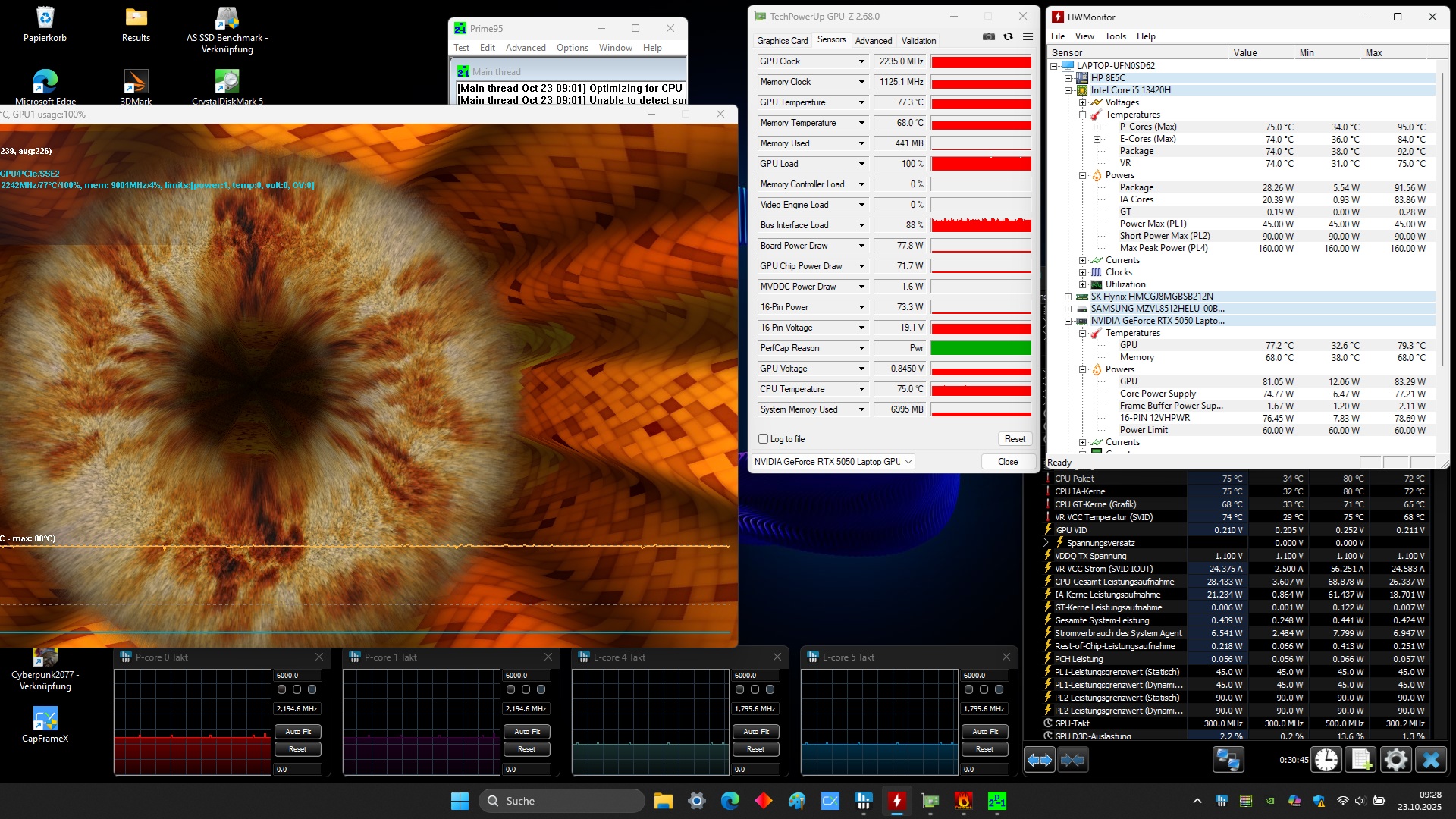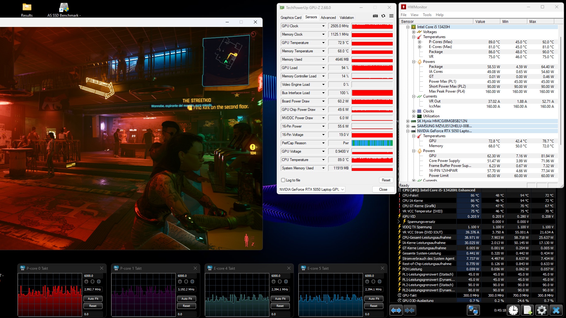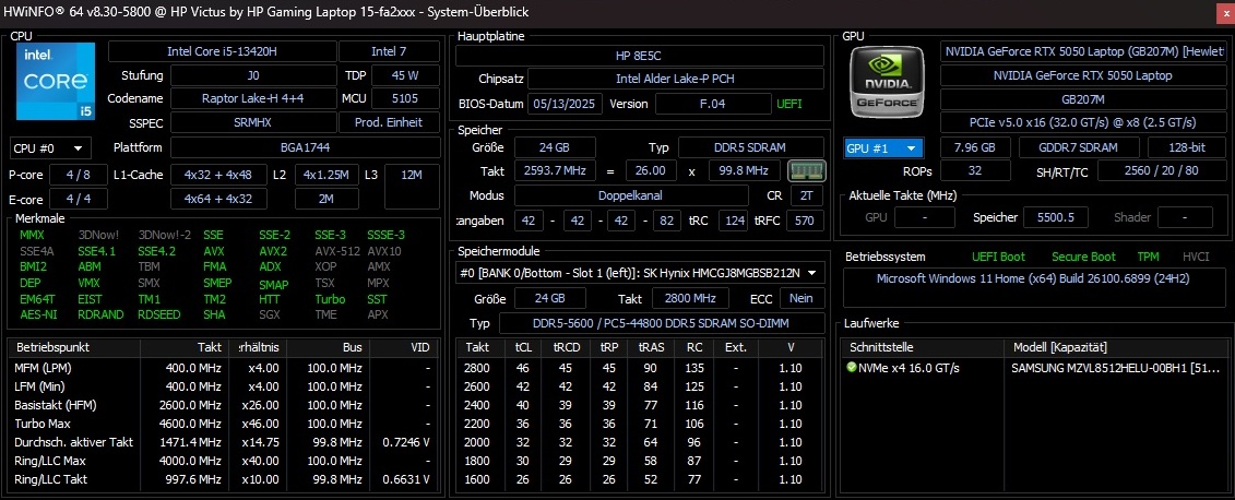 | HP Victus 15-fa2160ng i5-13420H, GeForce RTX 5050 Laptop | HP Victus 15-fa1057ng i5-13500H, GeForce RTX 4050 Laptop GPU | Medion Erazer Scout 17 E1 MD62758 Core 5 210H, GeForce RTX 5050 Laptop | Lenovo LOQ 15AHP10 R7 250, GeForce RTX 5060 Laptop | HP Omen 16-ap0091ng R9 8940HX, GeForce RTX 5060 Laptop | Average of class Gaming | |