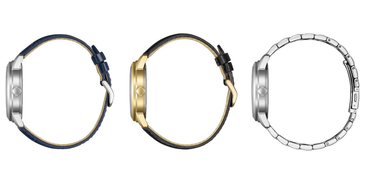 CitizenAW0151-00LC采用蓝银配色,深蓝色纹理表盘,搭配同色真皮表带。表壳和表带扣均为银色不锈钢。AW0153-04AC是另一款皮表带款式,这次采用的是黑色表带。这款手表拥有白色/奶油色表面和金色不锈钢外壳。最后两个表款是AW0151-85EC和AW0151-85XC均采用银色不锈钢外壳和表带。不过,AW0151-85EC 采用黑色纹理表盘,而 AW0151-85XC 则采用类似图案的绿色表面。