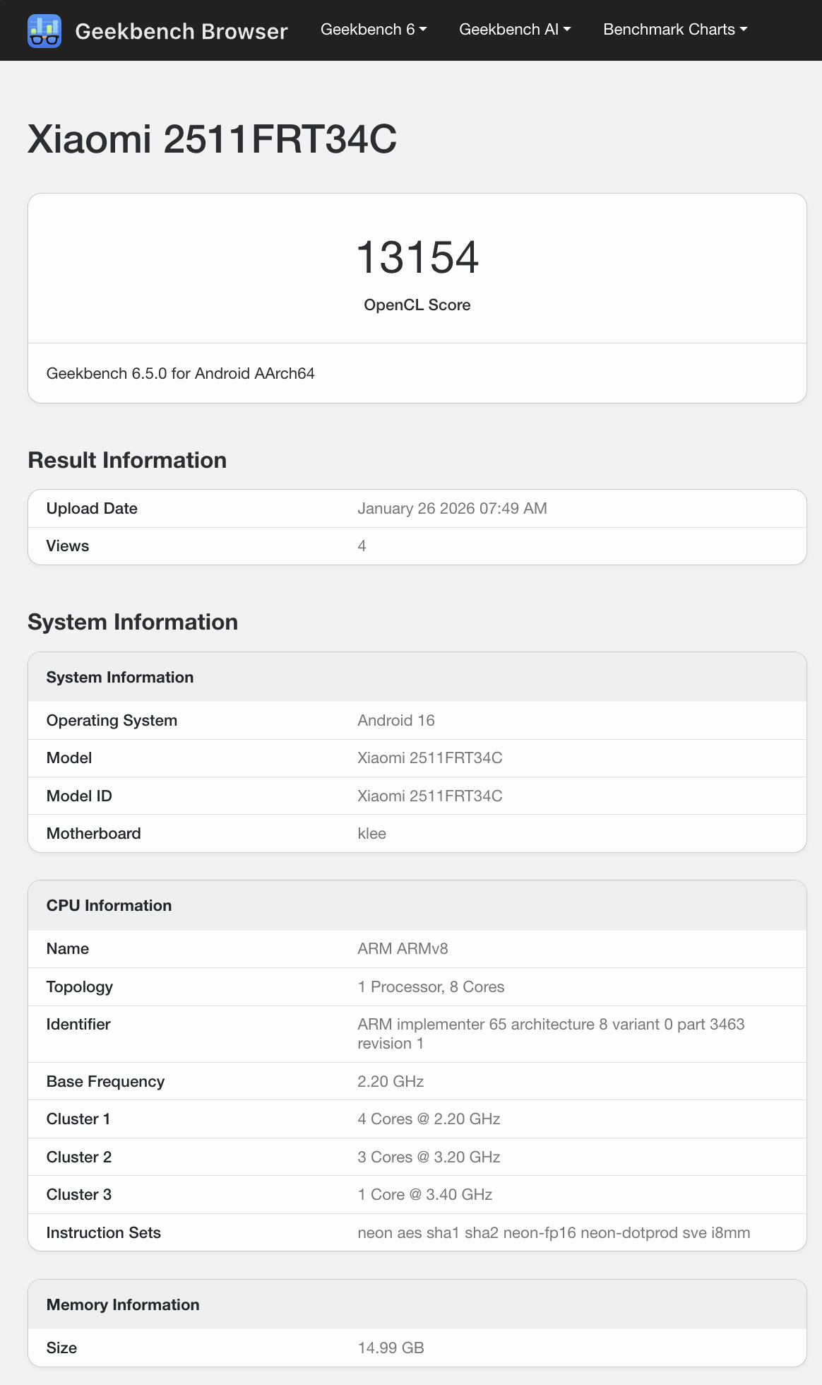 具体来说,红米 Turbo 5 及其 Dimensity 8500 芯片组在 Geekbench 6.5 中的单核和多核平均得分分别为 1,659 和 6,764 分,同时搭配 12 GB 或 16 GB 内存。与此同时,迄今为止出现的单 GPU 基准测试结果显示,红米 Turbo 5 得分为 13,154 分。