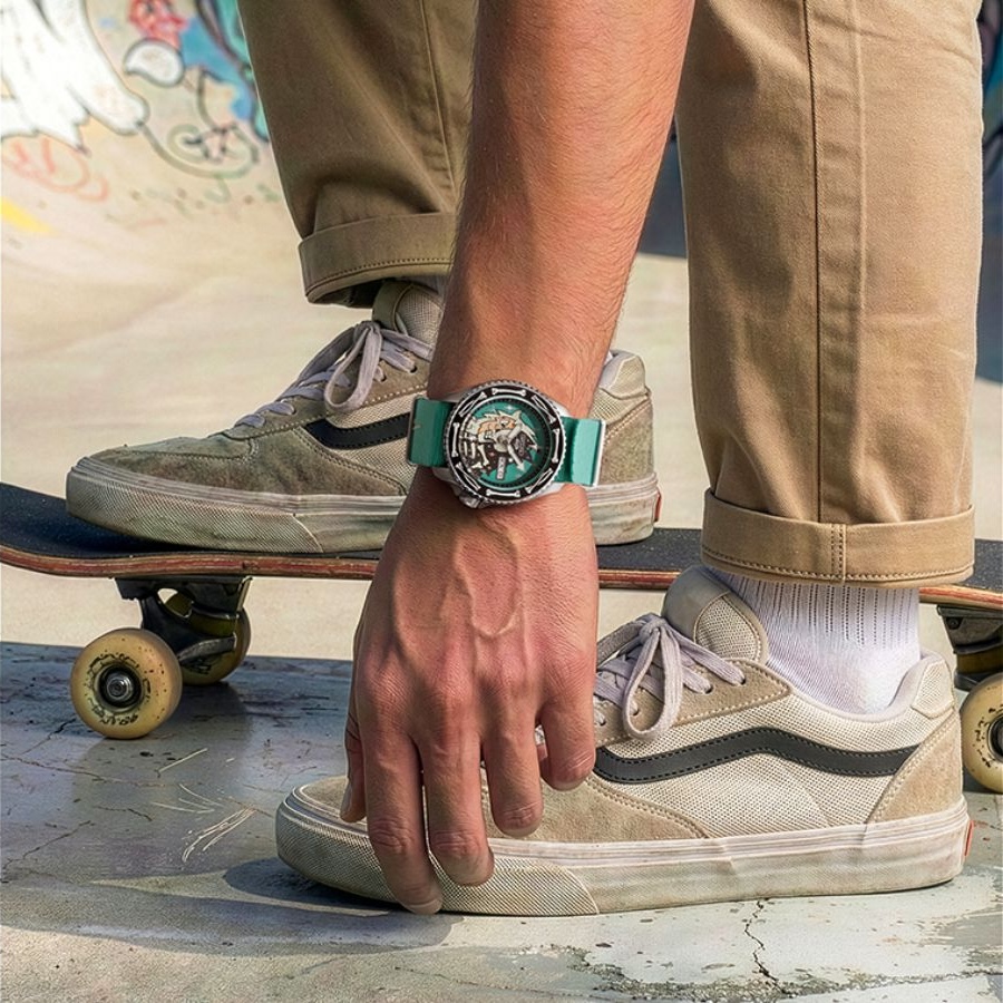 精工的 5 Sports x Poorboy 手表采用大胆的绿松石表盘,以艺术家的猴子形象为特色,灵感来自雪人和大脚怪。表圈上有醒目的黑白骨骼图案,银色不锈钢表壳尺寸为 42.5 x 13.4 x 46 毫米(约 1.67 x 0.53 x 1.81 英寸)。腕表配有可更换表带:与表壳相匹配的银色金属表链,以及与表盘背景色调相同的尼龙表带。