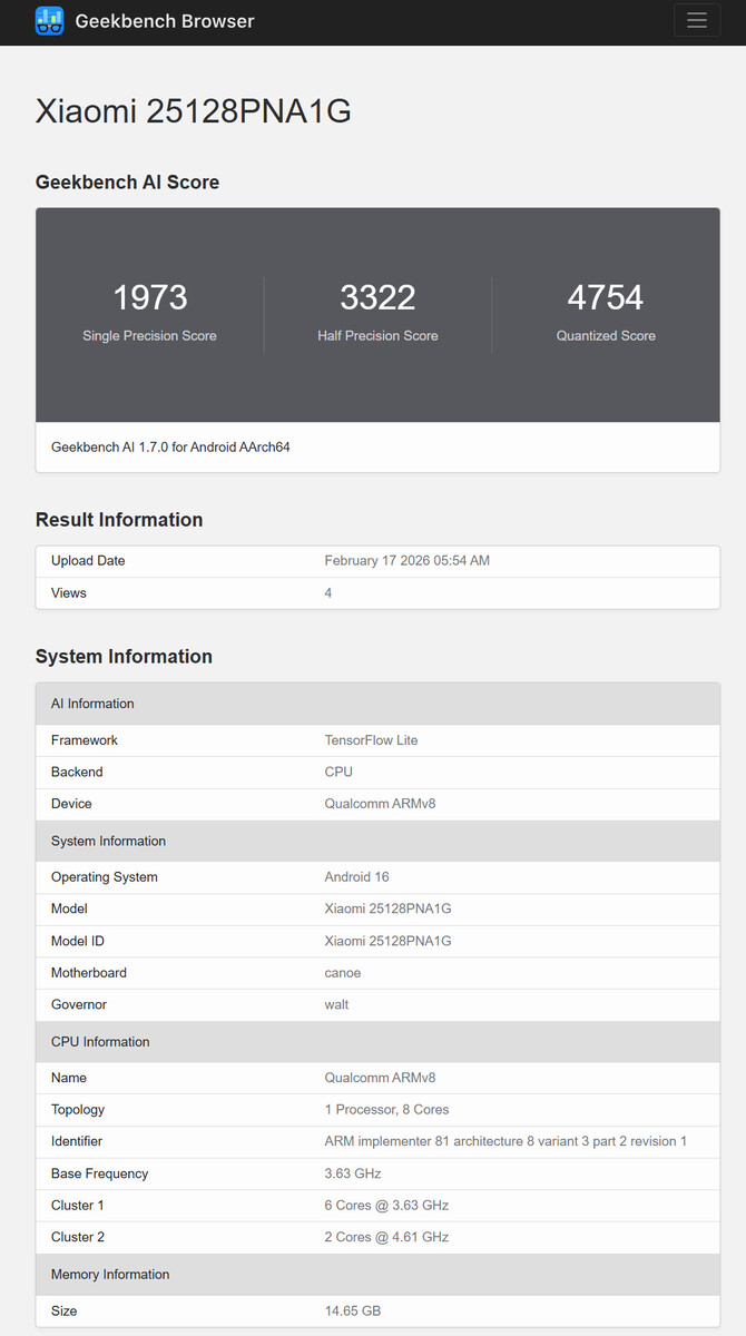 根据最近 监管机构认证小米可能会以 "小米徕卡手机"(Leica Leitzphone powered by Xiaomi)而非 "小米 17 Ultra 徕卡版"(Xiaomi 17 Ultra Leica Edition)的名称推出这款全球机型。无论名称如何,Geekbench 泄露的信息表明,在正式发布之前,有人正在积极测试这款全球机型。