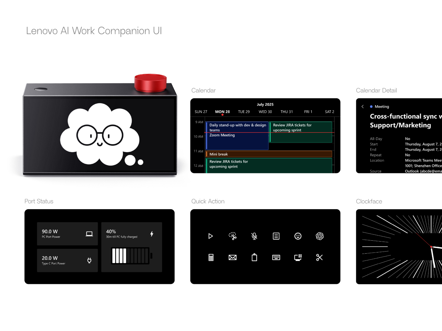 联想 AI Work Companion Concept 配备了一块屏幕,当与用户的设备同步时,它会显示用户的日程安排,包括任务和约会。此外,它还能监控用户的屏幕时间并建议休息时间,从而兼具数字健康设备的功能。联想表示,它甚至会在每周结束时提供一份已完成任务的详细报告。