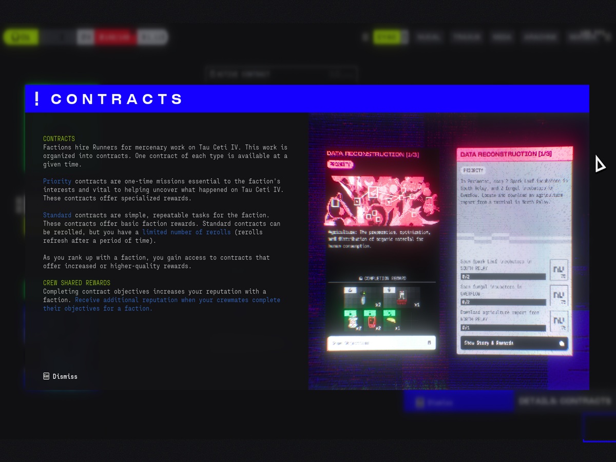 到目前为止,《马拉松》中最强大的结构理念是其派系驱动的合同系统。派系会雇佣 "奔跑者 "在陶塞提四号上工作,工作分为优先合同和标准合同。优先合约是与派系利益和陶塞提四号上发生的神秘事件相关的一次性工作,而标准合约则是可重复的任务,奖励更为常规。