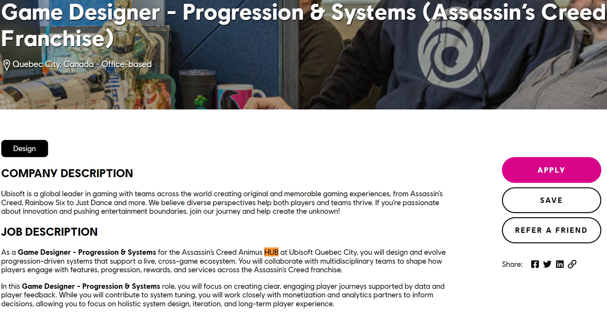 该开发人员的工作地点在魁北克市,负责优化《刺客信条》游戏中的 "进阶 "和 "系统"。招聘广告提到了连接多款游戏的 Animus Hub 启动器,要求 "在实时环境中不断改进 HUB 系统"。