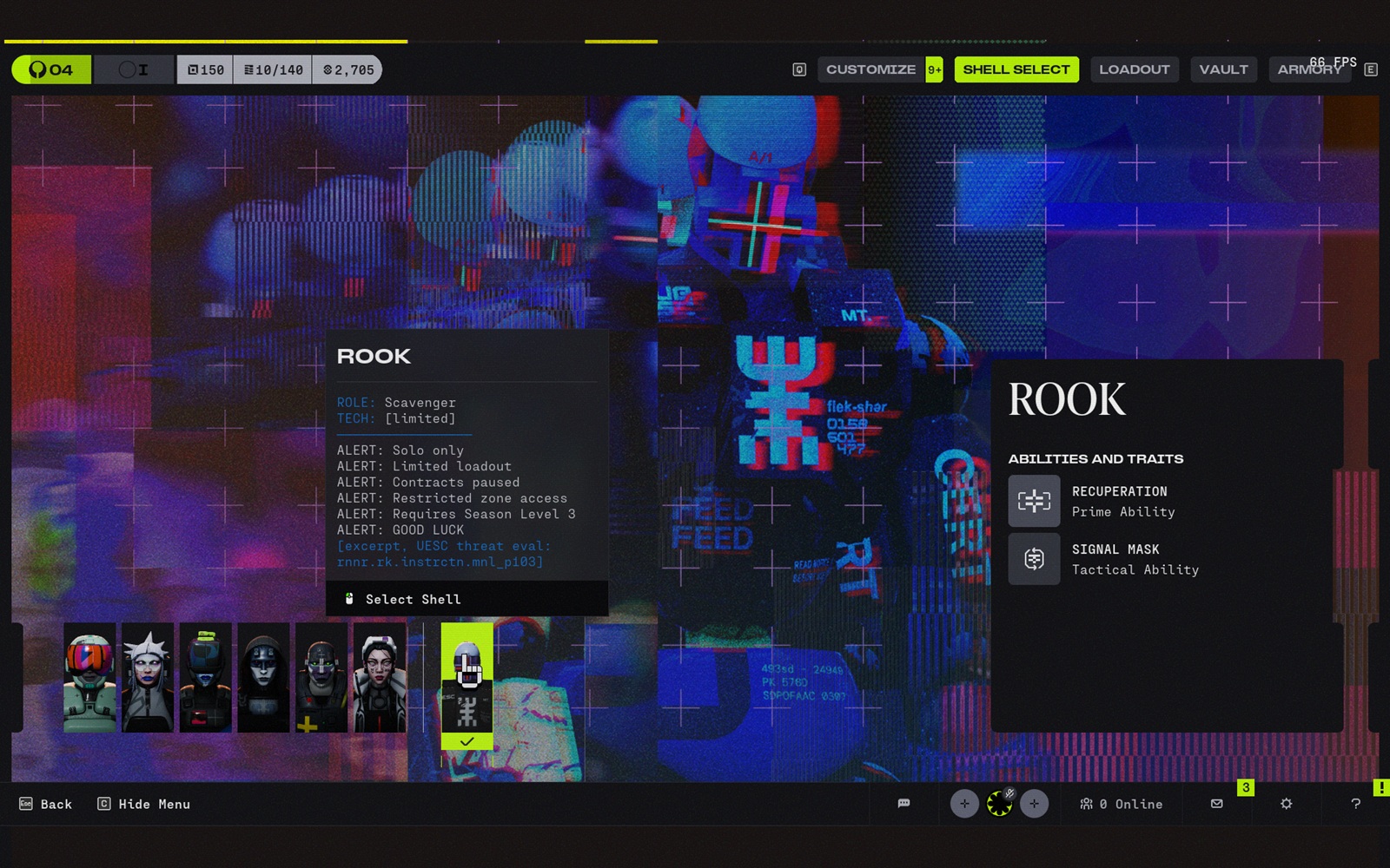 这种视觉识别也体现在比赛之外。运行前的外壳屏幕看起来光滑、装甲化、合成化,略显不伦不类,更像是为功能而制造的特殊机体,而不是为自我表达而打造的英雄角色。深色的镀层、硬朗的轮廓、厚重的面罩设计和霓虹灯框菜单强化了同一个概念:这些都是部署到敌对系统中的工具。这比传统的英雄射击游戏更适合《马拉松》的世界。
