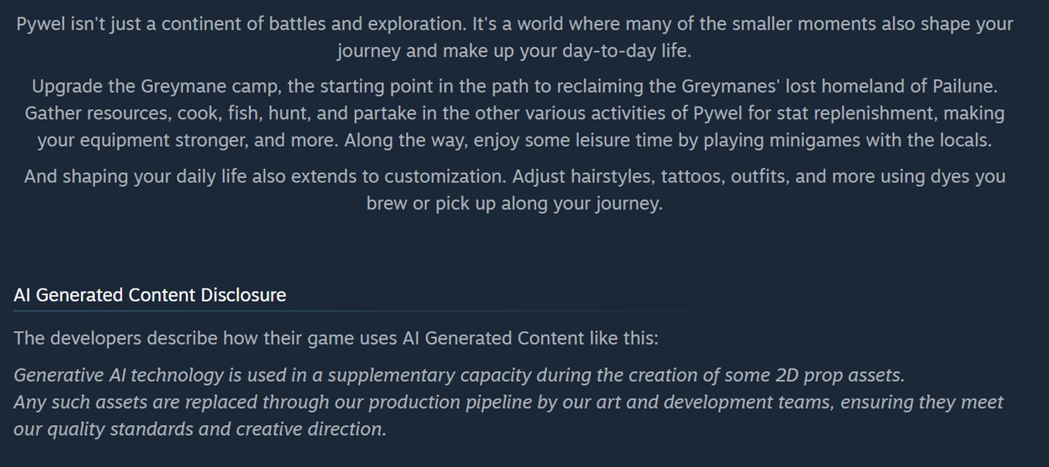 珍珠深渊》承认《深红沙漠》拥有人工智能生成的资产,并增加了蒸汽披露功能