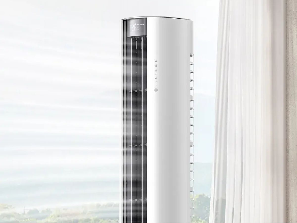 小米米家空调自然风立式 3HP 既能制冷又能制热,送风距离达 13 米(约 43 英尺),115° 广角覆盖,风量达 1,752 m³/h(约 61,800 英尺³/h)。据说它能提供 "自然舒适的气流"(机器翻译),从上部和下部产生轻柔的微风,分别提供天幕式和地毯式气流。