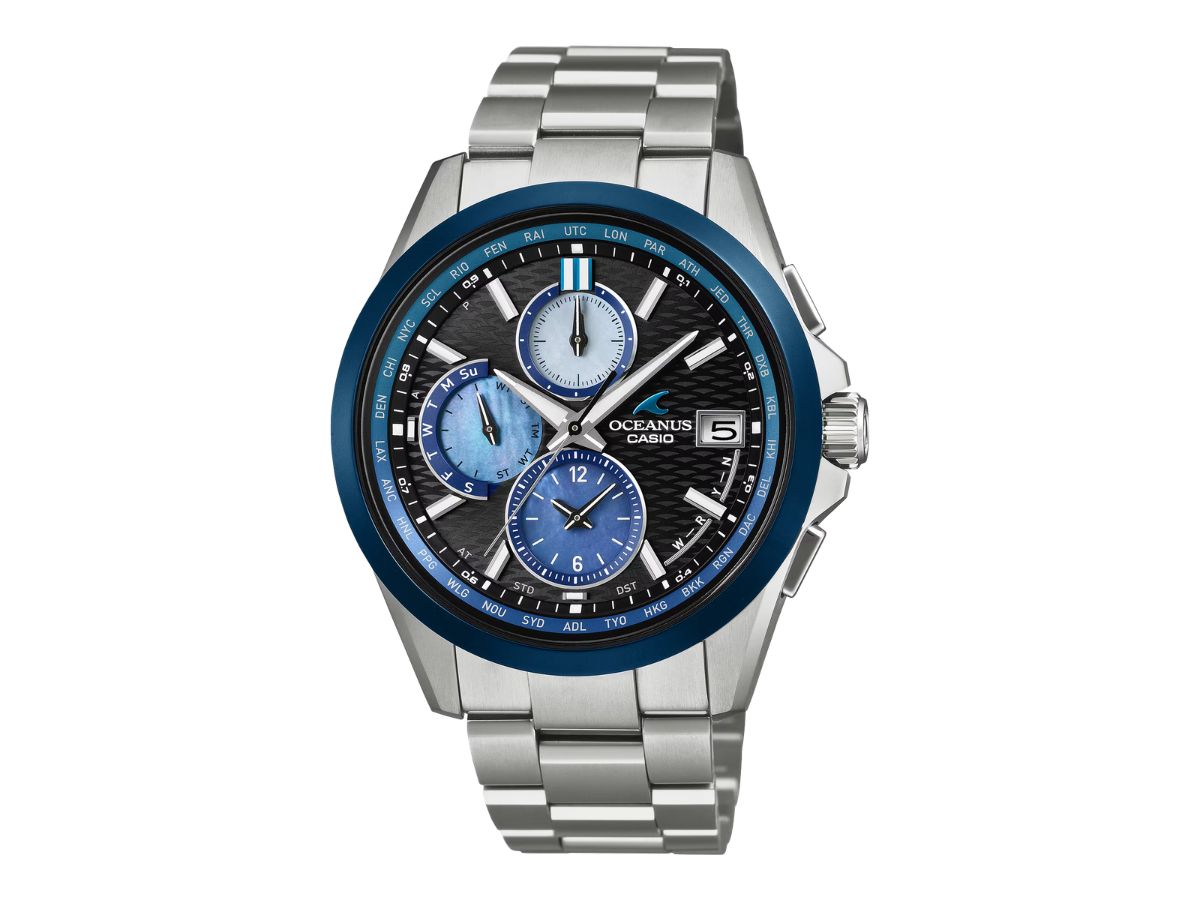 卡西欧的 Oceanus OCW-T2600AP-1A 是一款无线电控制(多频段 6)手表,支持世界时间。该表款有三个模拟指针、基本日期显示和星期显示。此外,小表盘上还有一个 1/20 秒的秒表,表盘环上还标注了不同的时区。该表款防水深度达 100 米,Tough Solar 太阳能充电可延长电池寿命。