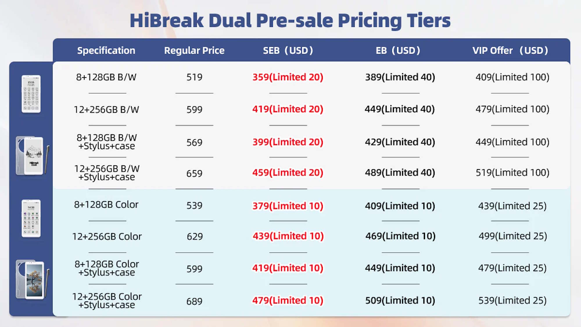 这款智能手机共有八个版本https://store.bigme.vip/pages/hibreak-dual-smartphone?.内存容量为 8GB 或 12GB,存储容量为 128GB 或 256GB,每种配置还提供带或不带彩色 E Ink 显示屏的版本。购买者既可以只订购 HiBreak Dual E-Ink 本身,也可以与手机壳和触控笔捆绑订购。尽管预购价格预计会有大幅折扣,但标明的正常零售价从 519 美元到 689 美元不等。这些折扣可能主要受数量而不是时间的限制。基础版的首批 20 台预计售价 359 美元,之后将升至 389 美元,再升至 409 美元。配备 12GB、256GB、手写笔和保护壳的高端版本售价分别为 479 美元、509 美元和 539 美元。