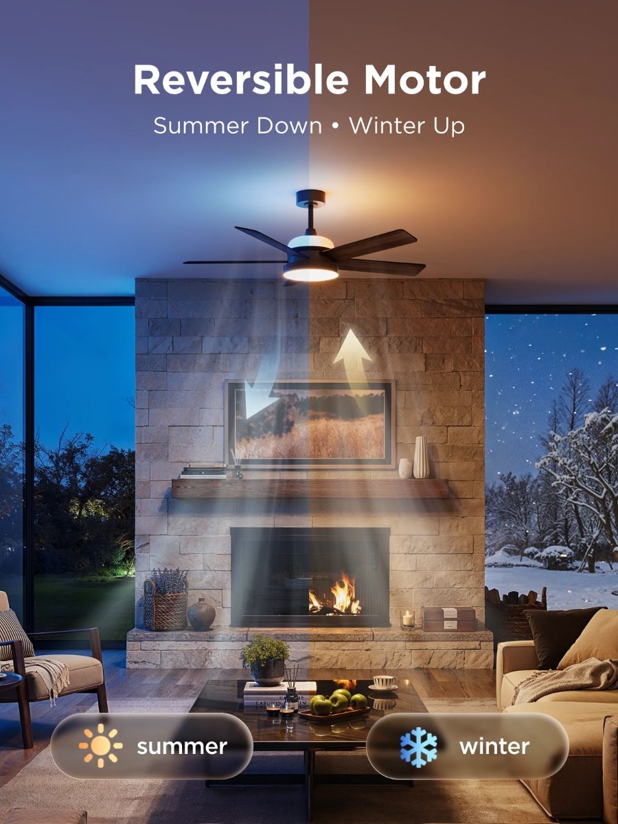 Govee 的这款吊扇可以快速冷却房间,风量高达 5000 英尺³/分钟(约 142 立方米/分钟)。用户可以选择六种速度设置,而且运行时噪音相对较小,电机产生的噪音约为 30 分贝。此外,可逆式电机还能在冬季将热量向上吸入并在室内循环。