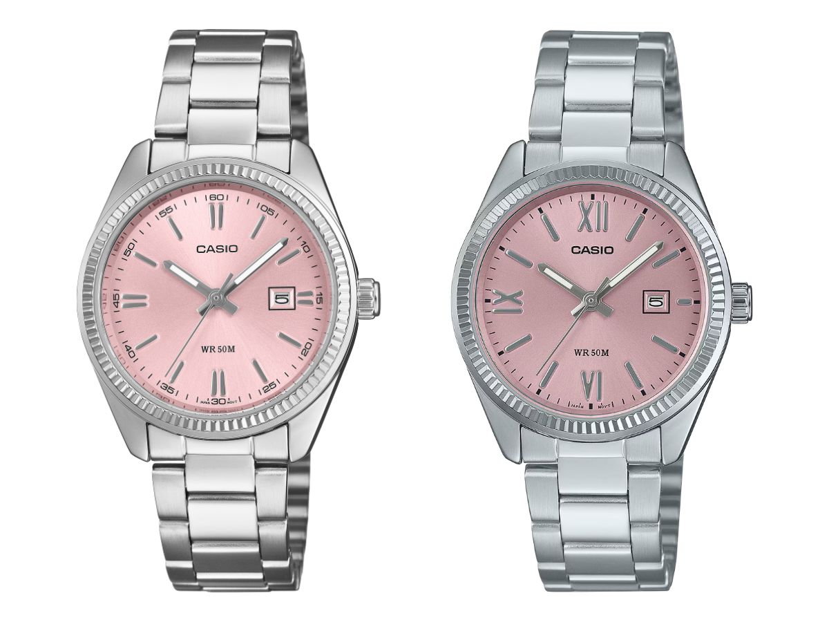 卡西欧新款 LTP-1302PD-4AV 采用粉红色太阳纹表盘,搭配银色刻度和指针。银色镀铬表壳与表盘相得益彰,表壳尺寸为 34.5 x 30.2 x 8.7 毫米(约 1.36 x 1.19 x 0.34 英寸)。该表款还配有不锈钢表链和凹槽表圈。