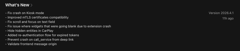 家庭助理 iOS 应用程序 2026.4.1 版的发布说明指出,已为过期令牌添加了重新认证流程。与 CarPlay 相关联的实体现在可以隐藏,与新的相互传输层安全(mTLS)认证功能相关的证书兼容性据称也得到了改善。
