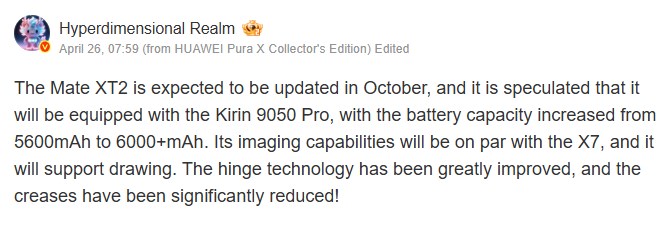 据爆料人 Hyperdimensional Realm 在微博上透露,华为计划在今年 10 月推出 Mate XT2。虽然该公司尚未证实任何消息,但泄露的信息让我们对这款即将推出的设备有了一个很好的了解。