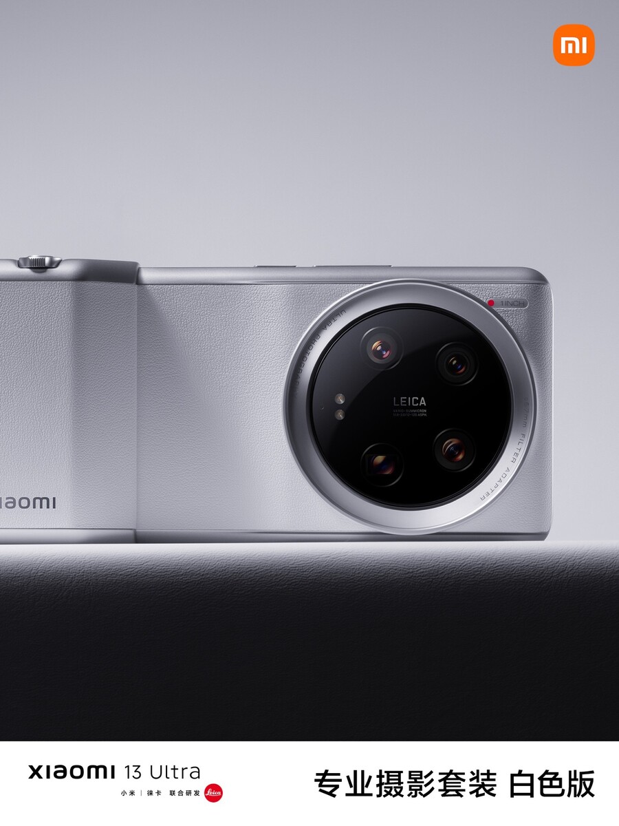 正如下面的图片所示,小米捆绑了一个带有无线快门按钮和变焦开关的相机手柄,一个保护套和一个67毫米的适配器环。作为参考,后者允许你安装镜头滤镜,如偏振或ND滤镜。该专业摄影套件还配有一个镜头盖,以保护玻璃相机阵列不被刮伤。目前,小米公司对小米13 Ultra的收费为人民币6998元(约合966美元)。小米13 Ultra及其白色专业摄影套件配件。小米还没有确认全球供应,尽管其CEO在他的全球推特账户上宣传该配件包.