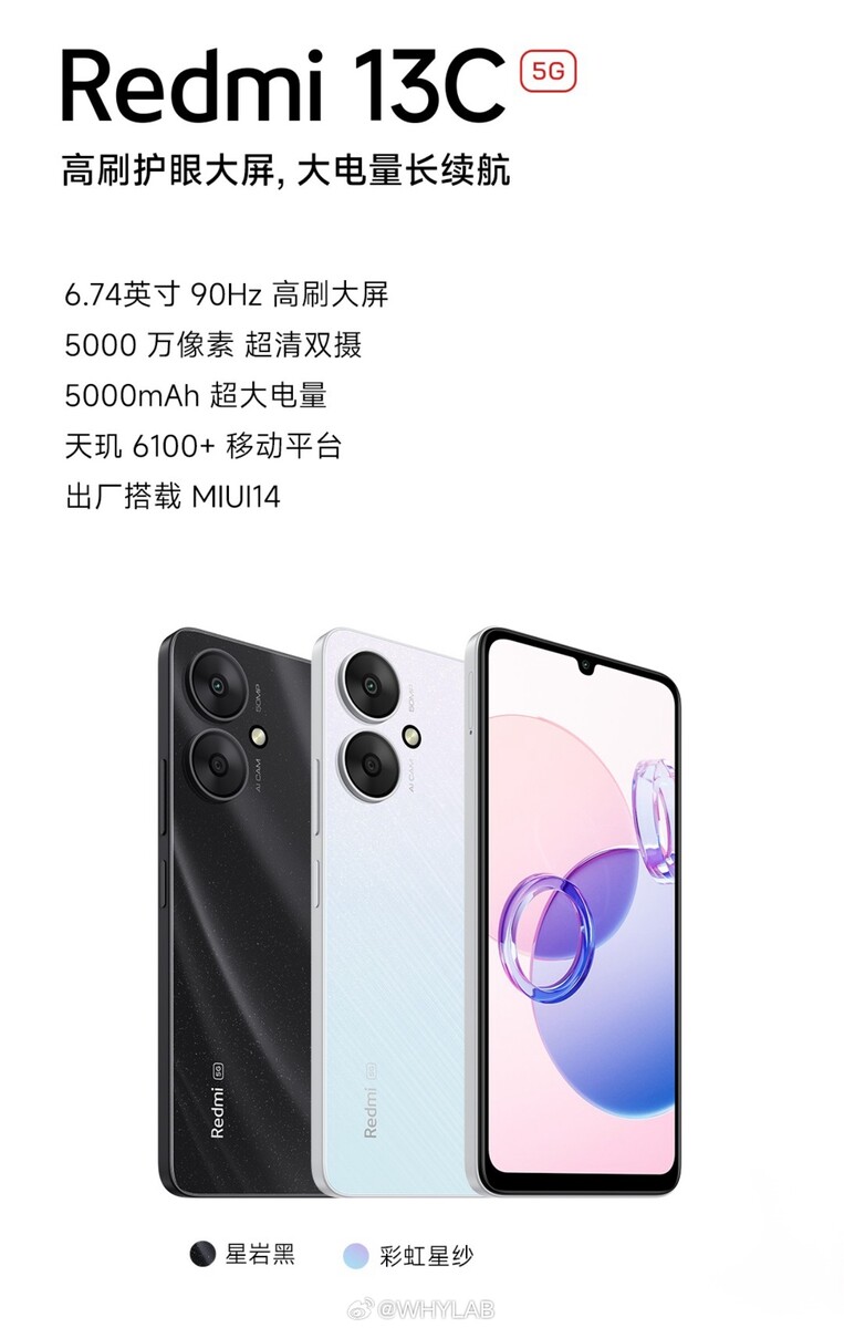 红米 13C 5G 的其他规格包括 5000 万像素主摄像头、500 万像素自拍摄像头、5000 毫安时电池、18 瓦充电、侧置指纹识别器、SD 卡支持和 MIUI 14。