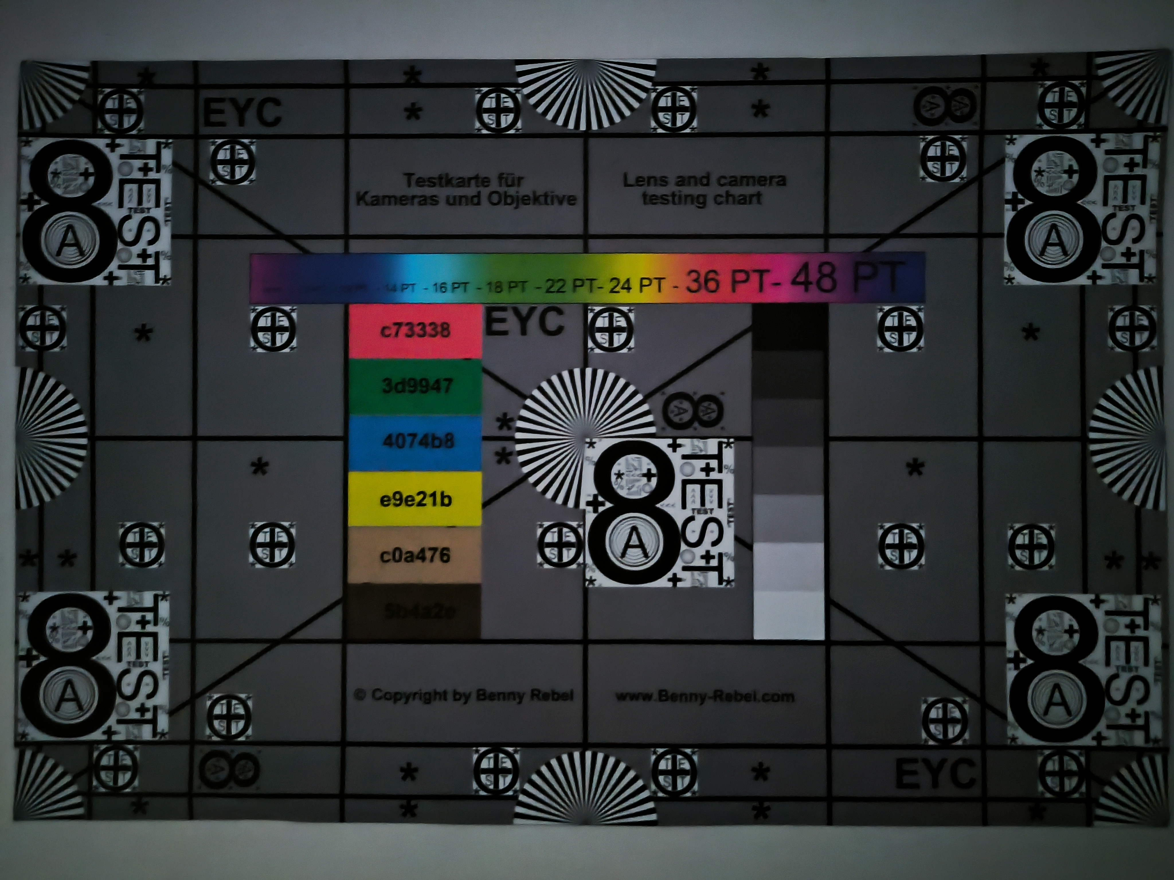 Tageslicht-Aufnahme 1Tageslicht-Aufnahme 2Ultraweitwinkel5-facher ZoomLowlight-Aufnahme在受控照明条件下,主相机的成像性能值得称赞。Delta-E 色彩偏差高达 21.23,比较明显。特别是,绿色色调偶尔会比 ColorChecker 色彩表中的参考色亮得多。尽管只有 1 勒克斯的残余光,小米 13T 仍能显示测试图表,尽管有明显的模糊。
