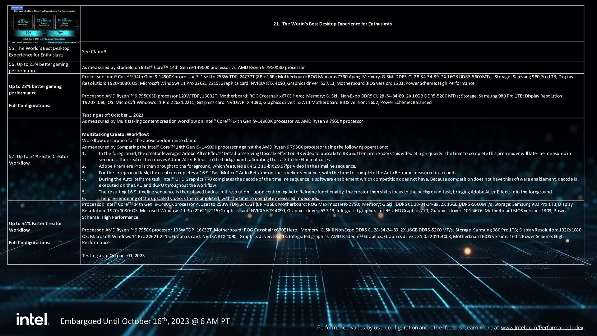 总体而言,英特尔宣称酷睿 i9-14900K 的游戏性能比 Ryzen 9 7950X3D 高出 23%。脚注显示,这是在 1080p 下运行Starfield游戏时的表现。