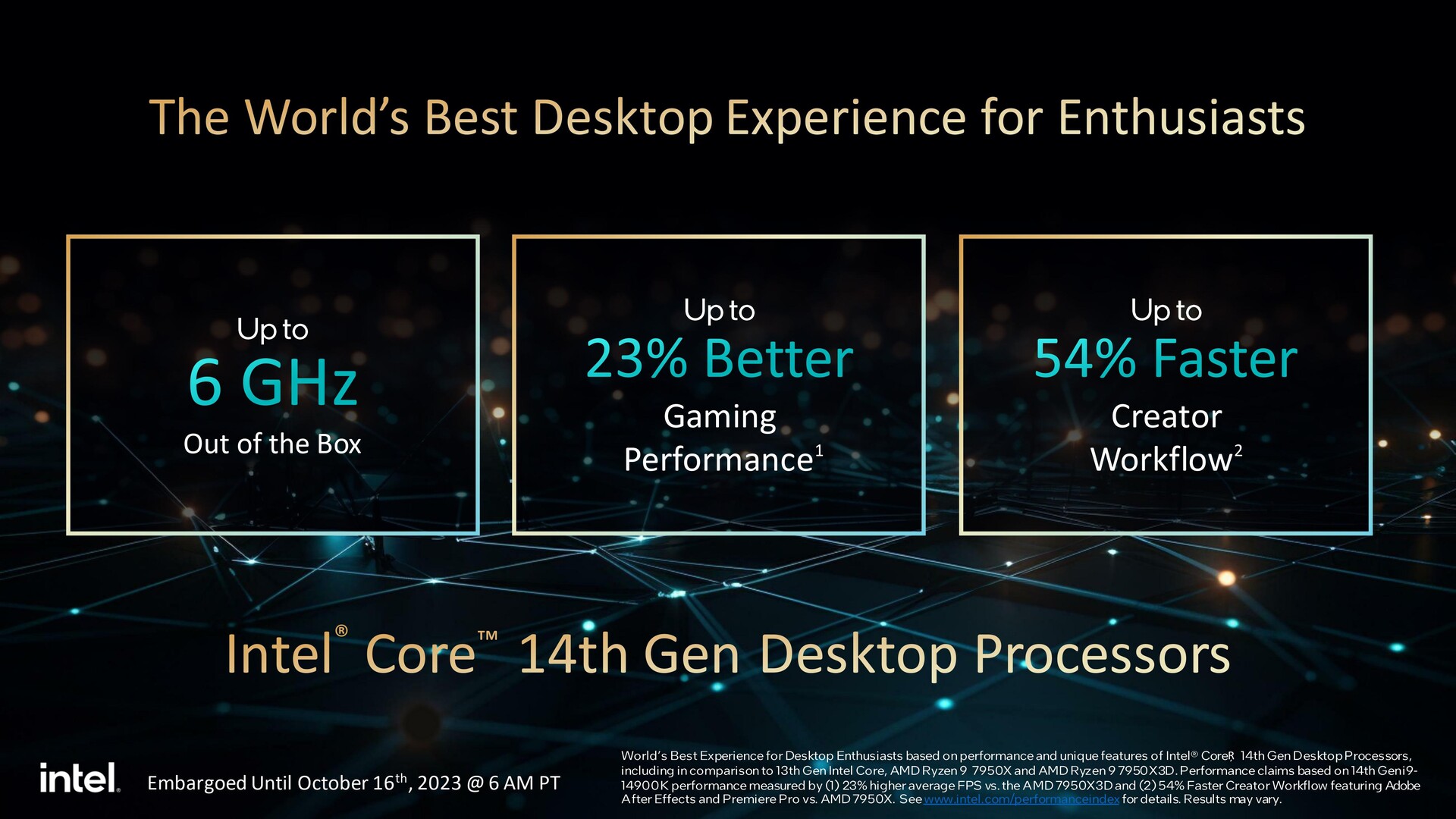 我们将在明天的评测中公布自己的游戏和性能基准,但英特尔的营销数据显示,与 AMD 的桌面 Zen 4 产品(如 Ryzen 9 7950X和 Ryzen 9 7950X3D.英特尔还强调了 99% 百分位数的重要性。同样,第 14 代处理器在这些指标上的优势在很大程度上取决于游戏。
