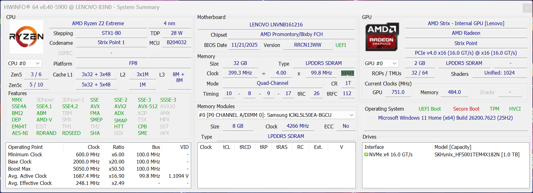 | Lenovo Legion Go 2 Ryzen Z2 Extreme, Radeon 890M, SK hynix PVC10 HFS001TEM4X182N, OLED, 1920x1200, 8.8" | Asus ROG Xbox Ally X Ryzen Z2 Extreme, Radeon 890M, Samsung MZVMA1T0HCLD, IPS, 1920x1080, 7" | MSI Claw A8 BZ2EM Ryzen Z2 Extreme, Radeon 890M, Micron 2500 1TB MTFDKBA1T0QGN, IPS, 1920x1200, 8" | ONEXPLAYER X1 Pro GA15H-HX370-32GB-1TB-H Ryzen AI 9 HX 370, Radeon 890M, Acer N7000 1 TB, IPS, 2560x1600, 11" | GPD Pocket 4 Ryzen AI 9 HX 370, Radeon 890M, , IPS, 2560x1600, 8.8" | MSI Claw 8 AI+ Core Ultra 7 258V, Arc 140V, Kioxia BG6 KBG60ZNS1T02, IPS, 1920x1200, 8" | Lenovo Legion Go Z1 Extreme, Radeon 780M, WD PC SN740 512GB SDDPMQD-512G-1101, IPS, 2560x1600, 8.8" | Average AMD Radeon 890M | Average of class Handheld / UMPC | |