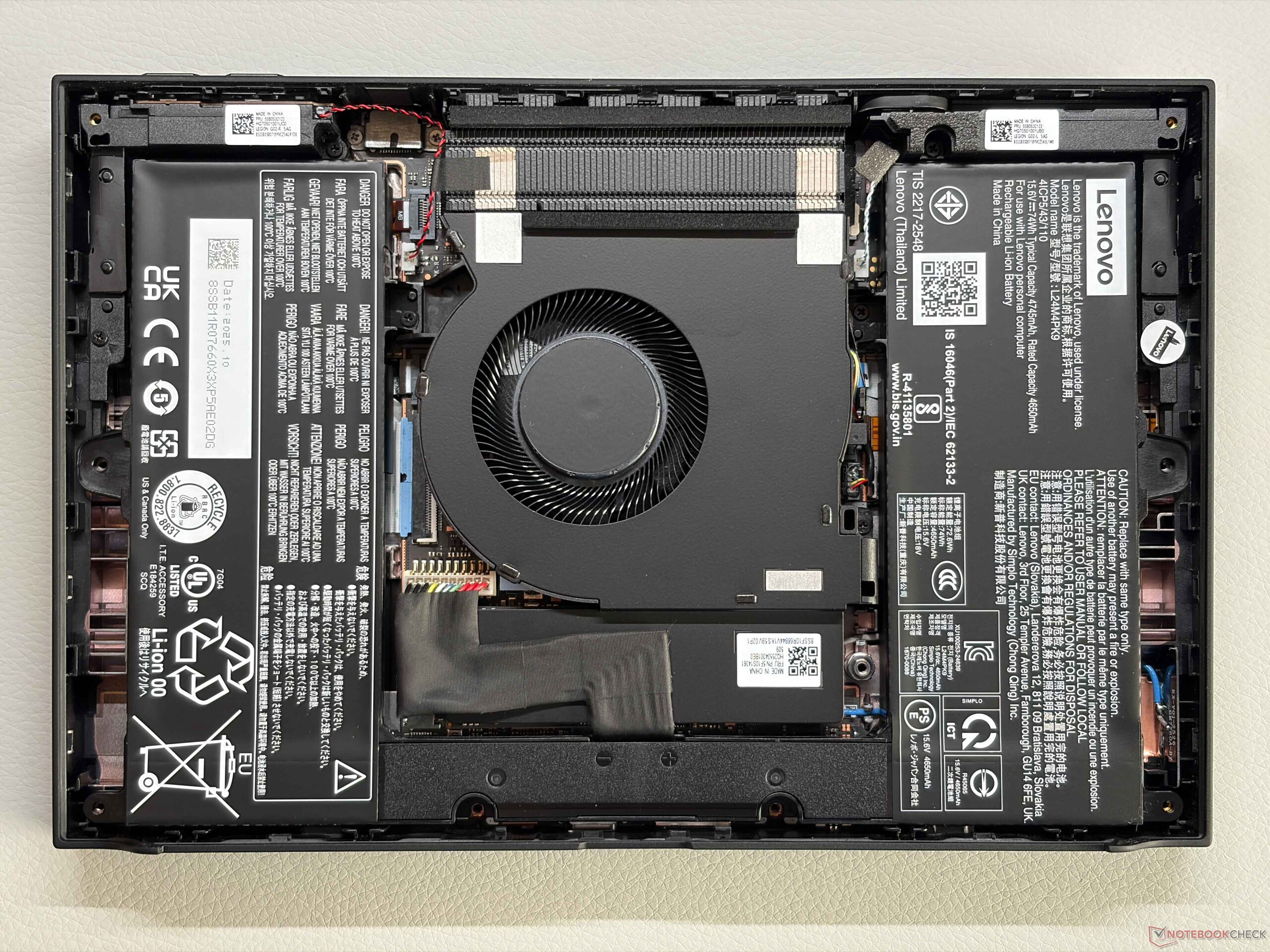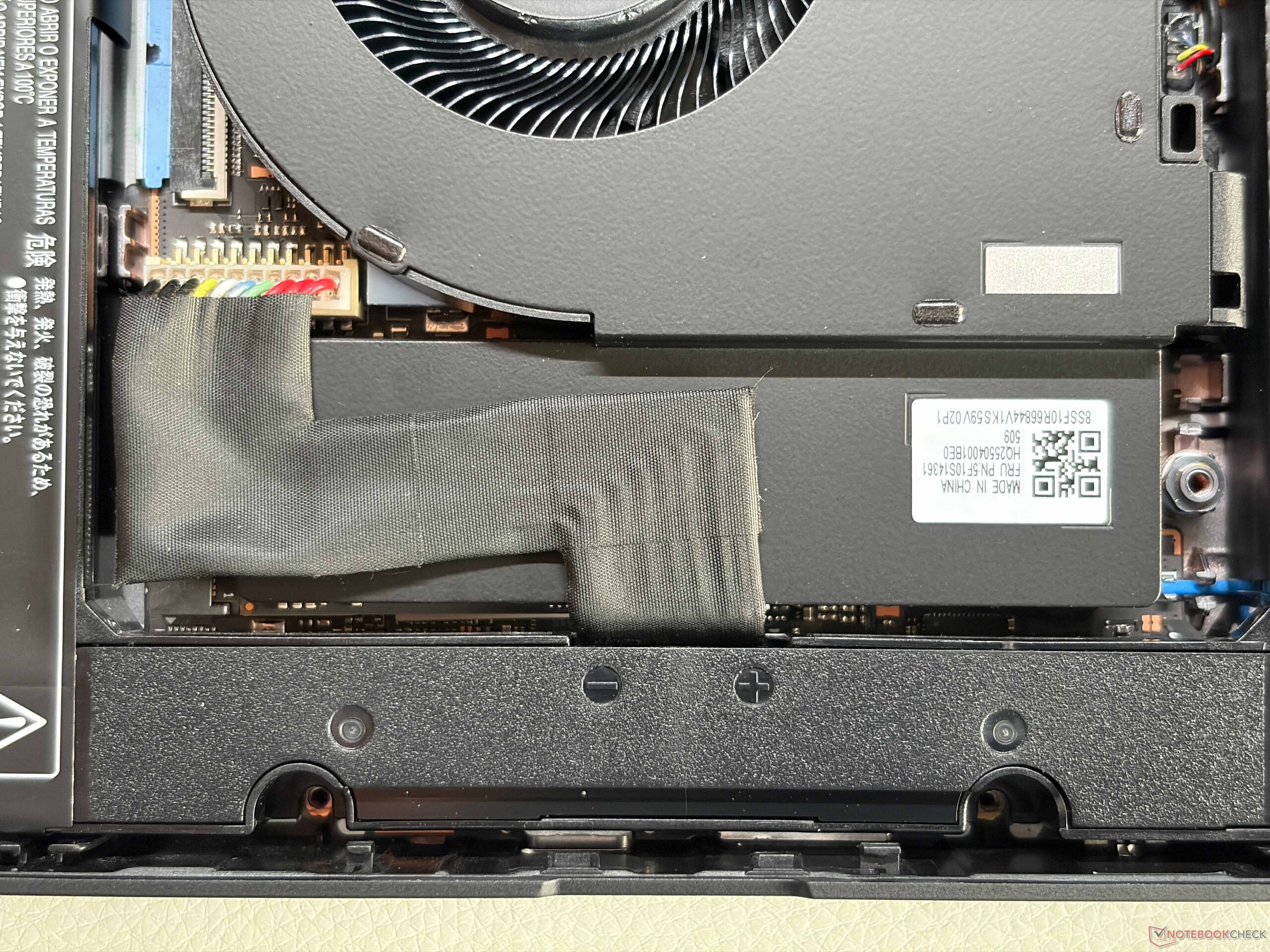 内部布局也进行了重新设计。电池现在位于两侧,中间是一个风扇。M.2 2280 固态硬盘位于下方,可以更换,但必须先断开电缆连接。尽管价格不菲,但该设备仍不支持 Wi-Fi 7。