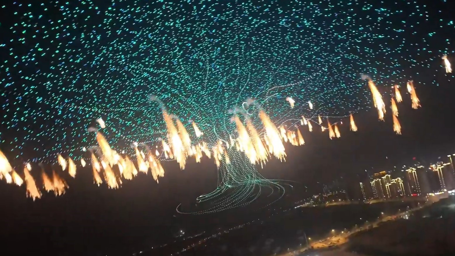 在表演过程中,数千架无人机组成了一棵巨大的 "天空之树",在夜空中闪耀着绚丽的光芒,然后在树阵底部燃放烟花,宛如精灵一般。虽然浏阳每周六晚都会举办焰火晚会,但这次创纪录的活动却与众不同。