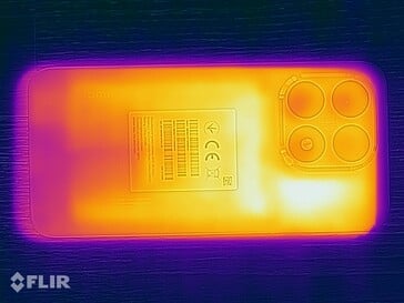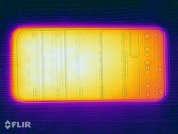 (±) The maximum temperature on the upper side is 42.8 °C / 109 F, compared to the average of 35.2 °C / 95 F, ranging from 21.9 to 247 °C for the class Smartphone.